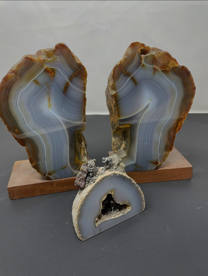 This unique set features a beautiful pair of polished agate geode bookends with striking natural banding in shades of gray, blue, and amber. Each geode half is mounted on a wooden base, enhancing its display appeal. A separate geode slice with a natural crystal-lined cavity adds an extra touch of elegance. A standout feature is the miniature mining scene intricately placed within the geode slice, complete with a tiny miner figurine, mining cart, and pyrite accents, creating a captivating diorama. Key Details: Material: Natural agate geodes with crystal interiors Design: Polished bookends with a separate geode slice featuring a miniature mining scene Condition: Good vintage condition with natural imperfections and rough edges.