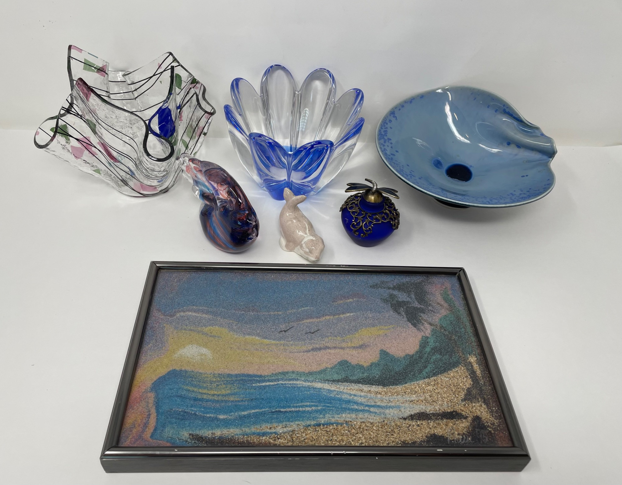 Elevate your collection with these stunning handcrafted and artistic glass pieces: Orrefors Sweden "Maui 95" Sand Art Blue Candy Dish – A mesmerizing fusion of artistry and function, this Swedish-crafted dish boasts a vibrant blue sand art design. Hot Island Glass Fish (2005, Signed) – A striking, hand-blown glass fish sculpture from Hot Island Glass, signed and dated 2005. A true collector’s piece! Mt. St. Helens Ash Painted Seal – Crafted from volcanic ash, this intricately painted seal figurine captures the spirit of nature with its unique texture and detail. Blue & Gold Ornate Bottle with Dragonfly Lid – A touch of elegance! This decorative bottle features an intricate blue and gold design, topped with a beautifully detailed dragonfly lid. Excellent condition with minimal wear.