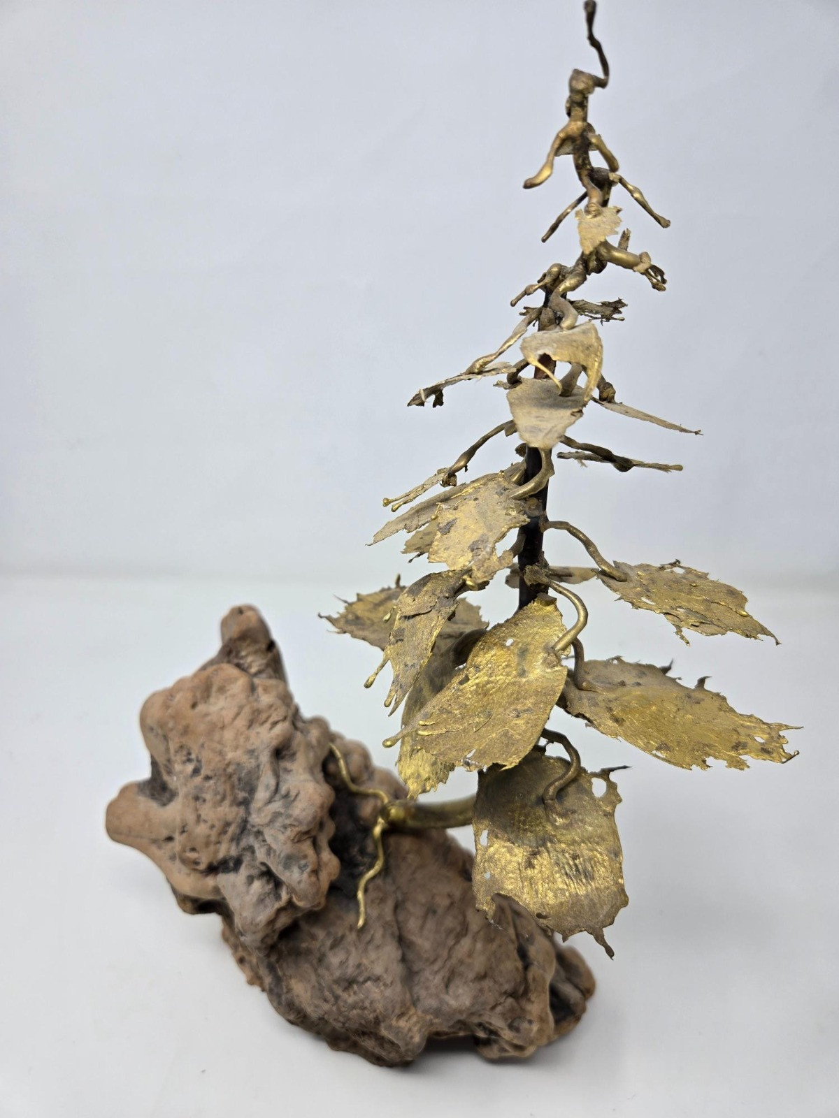 This striking Mid-Century Modern sculpture features a handcrafted brass tree with intricate, textured metal leaves, mounted on a natural driftwood base. Signed by the artist Ross 11/81, the piece is attributed to American sculptor Ross Bendixen. Materials: Brass, metal, and driftwood Design: Freeform, organic Mid-Century aesthetic Signature: Artist-signed "Ross 11/81" Condition: Displays natural patina with minor signs of age, adding to its vintage character.