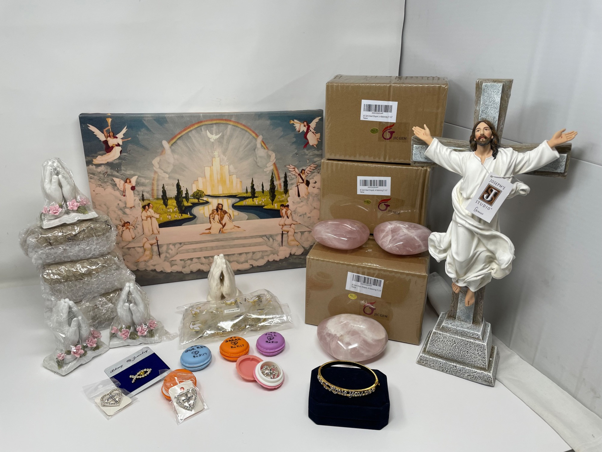 This unique collection includes a variety of religious and inspirational items, perfect for collectors, home décor, or gifting. Features: Resurrected Jesus on Cross Statue – A detailed resin or ceramic statue depicting Jesus in white robes on a textured cross with a sturdy base. Praying Hands Figurines – Multiple styles of praying hands statues, including a pair with floral accents. Heavenly Kingdom Canvas Print – A vibrant religious artwork depicting a celestial scene with angels and a golden city. Rose Quartz Heart Stones – Three polished rose quartz hearts, symbolizing love and healing. Gold-Tone "Love You" Bracelet – Elegant bracelet with intricate script design. Inspirational Tokens & Charms – Includes personalized round keepsakes with names and Bible verses, cross-shaped pendants, and Christian-themed jewelry. Faith-Based Accessories – Includes packaged religious-themed brooches, earrings, and decorative pieces. Condition: Items are in good condition, with some new in original packaging and others displaying minor wear consistent with age.