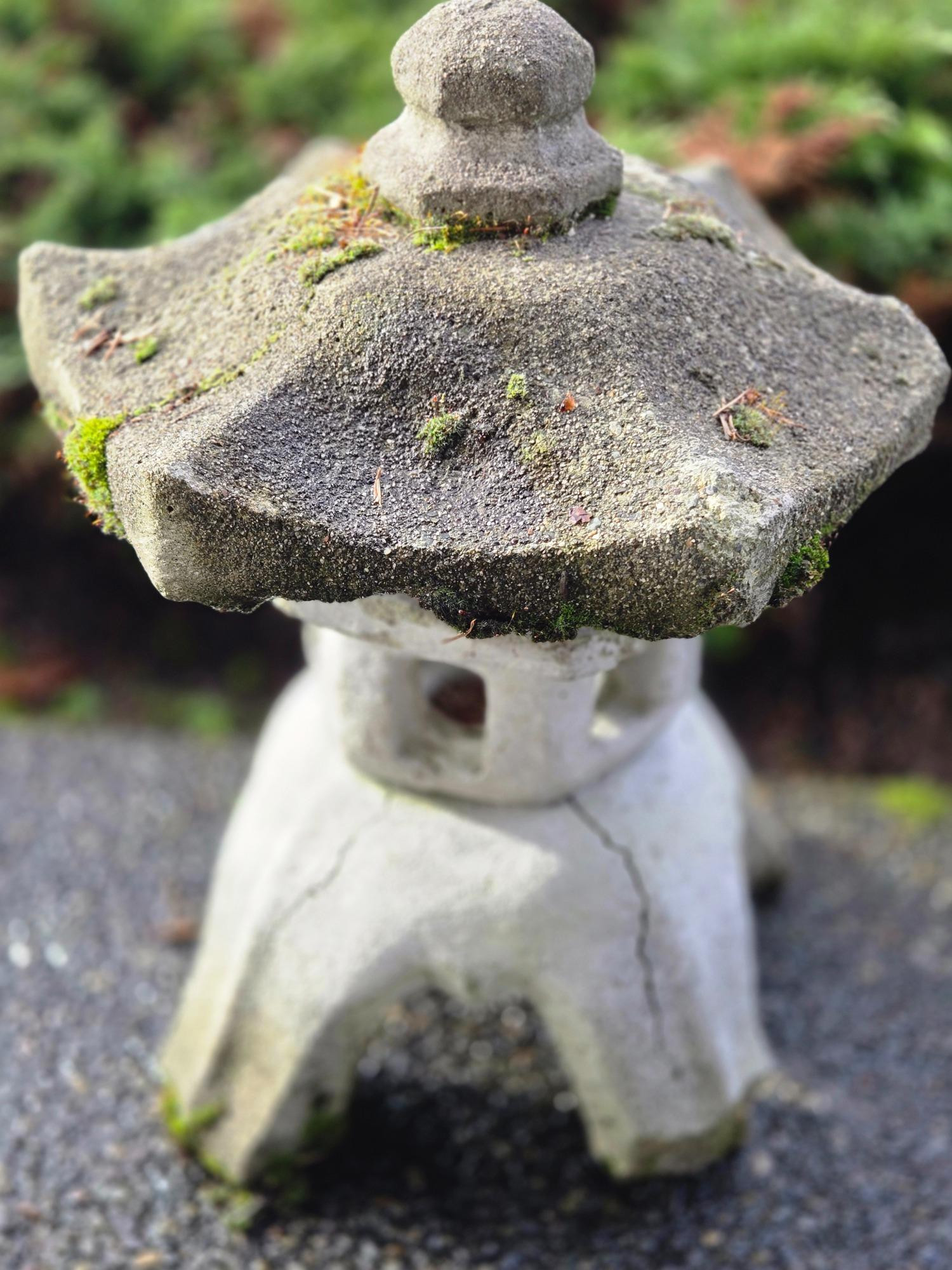 Japanese Cement Pagoda- 13" Tall x 13" W The object in the image is a Japanese stone lantern, also