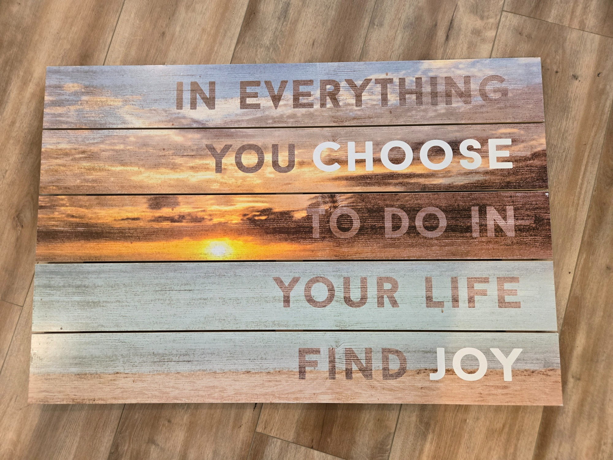 Bring positivity into your space with this beautiful wooden wall art featuring an uplifting quote: "In everything you choose to do in your life, find joy." The design showcases a serene sunset background with rustic wood paneling for a warm, coastal aesthetic. Material: Wood Design: Rustic, distressed finish with inspirational text Condition: Good condition with minimal wear (see images for details) Mounting: Ready to hang with attached hardware