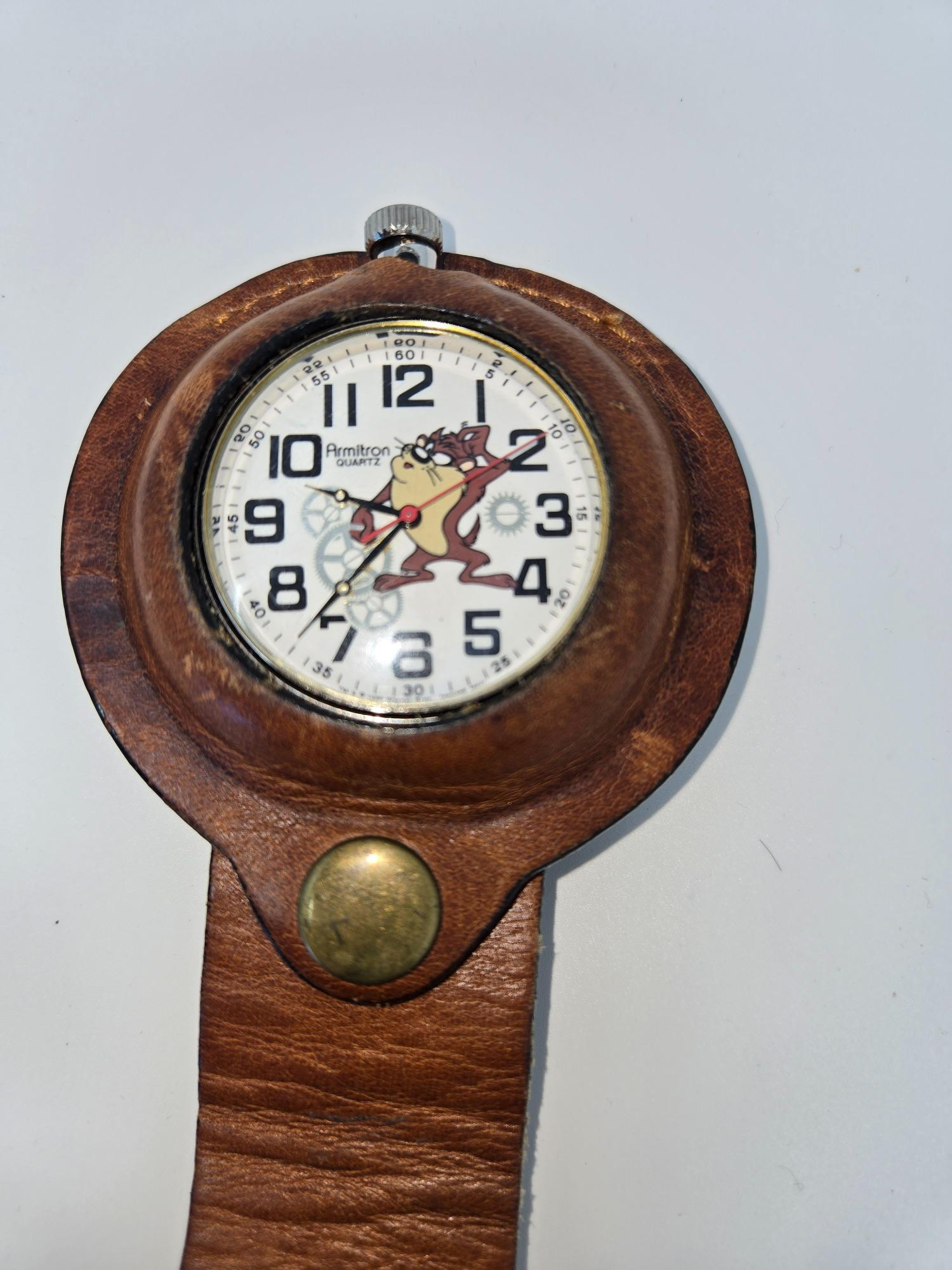 character Brand: Armitron, founded in 1975. Type: Pocket watch, designed to be carried in a pocket. Design: Features the Looney Tunes character, the Tasmanian