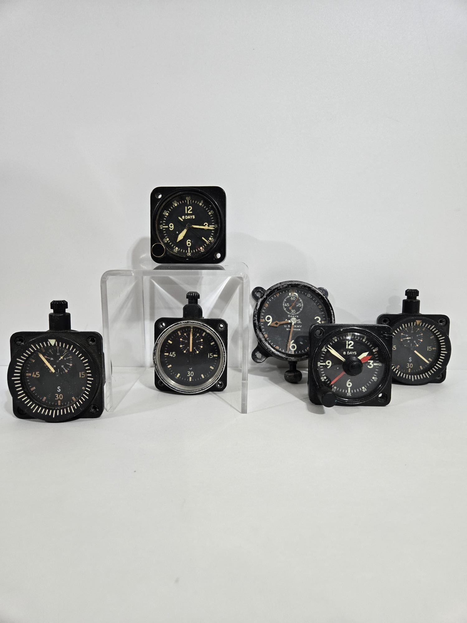 Collection of six Aviation or Aircraft Clocks Group of six vintage aviation or aircraft clocks in black