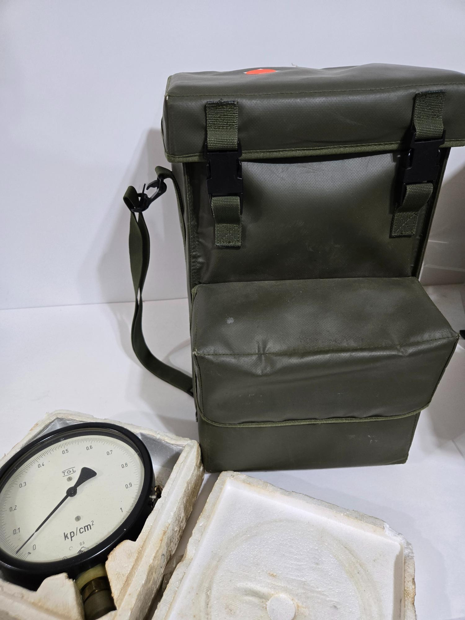 Graseby GID-3 Military Insulated Padded Case This military-grade case is ideal for protecting sensitive equipment or repurposing as a rugged gear bag. Material: Heavy-duty, water-resistant vinyl. Insulation: Padded interior for impact and temperature protection. Compartments: One large main compartment (14 x 8.5 x 9.5 inches) and two side pockets (7.5 x 4 x 9 inches). Portability: Adjustable shoulder strap. Vintage Ametek US Gauge Pressure Gauge An industrial-grade Ametek US Gauge, used for measuring pressure in kp/cm², ideal for mechanical and industrial applications. Range: 0–1 kp/cm². Material: Steel/aluminum case, copper/iron-nickel internal spring. Usage: Suitable for liquids, steam, and gases. Both items are great for collectors, restoration projects, or repurposing in vintage industrial settings.