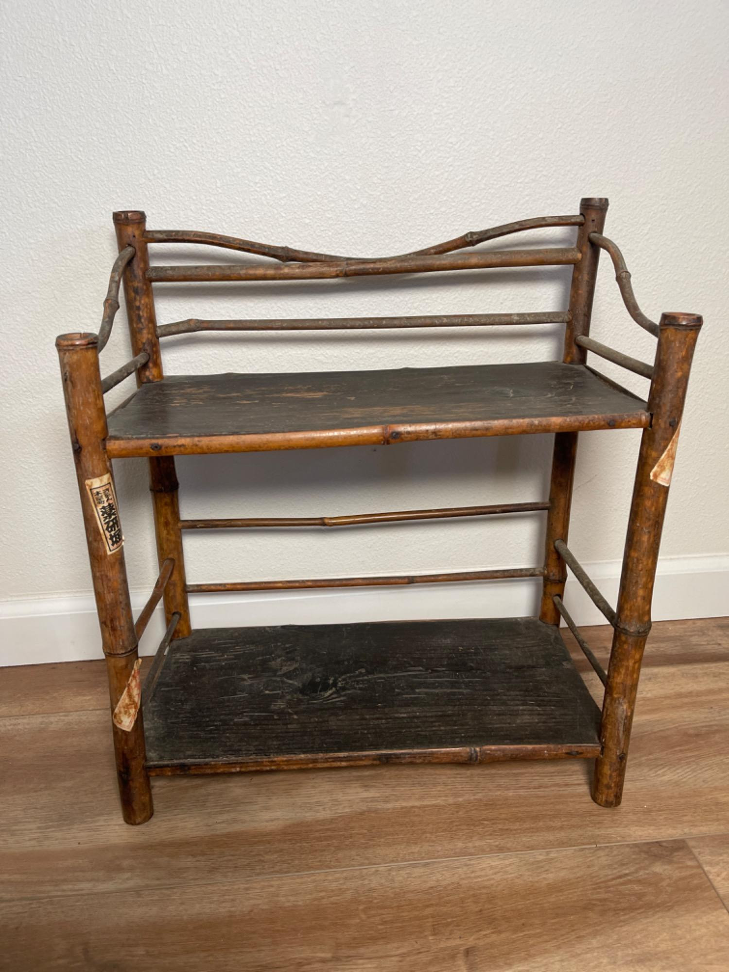 Antique Bamboo Tabletop Shelf – Rustic Charm & Timeless Elegance Add a touch of vintage charm to your space with this antique bamboo tabletop shelf. Crafted with natural bamboo, this petite shelving unit features two dark wooden tiers, supported by an intricately designed bamboo frame. Its organic curves and delicate branch-like details evoke a rustic yet sophisticated aesthetic, making it an ideal accent for any décor style. This piece is fragile and likely needs some reinforcing. Many scratches and scuffs.