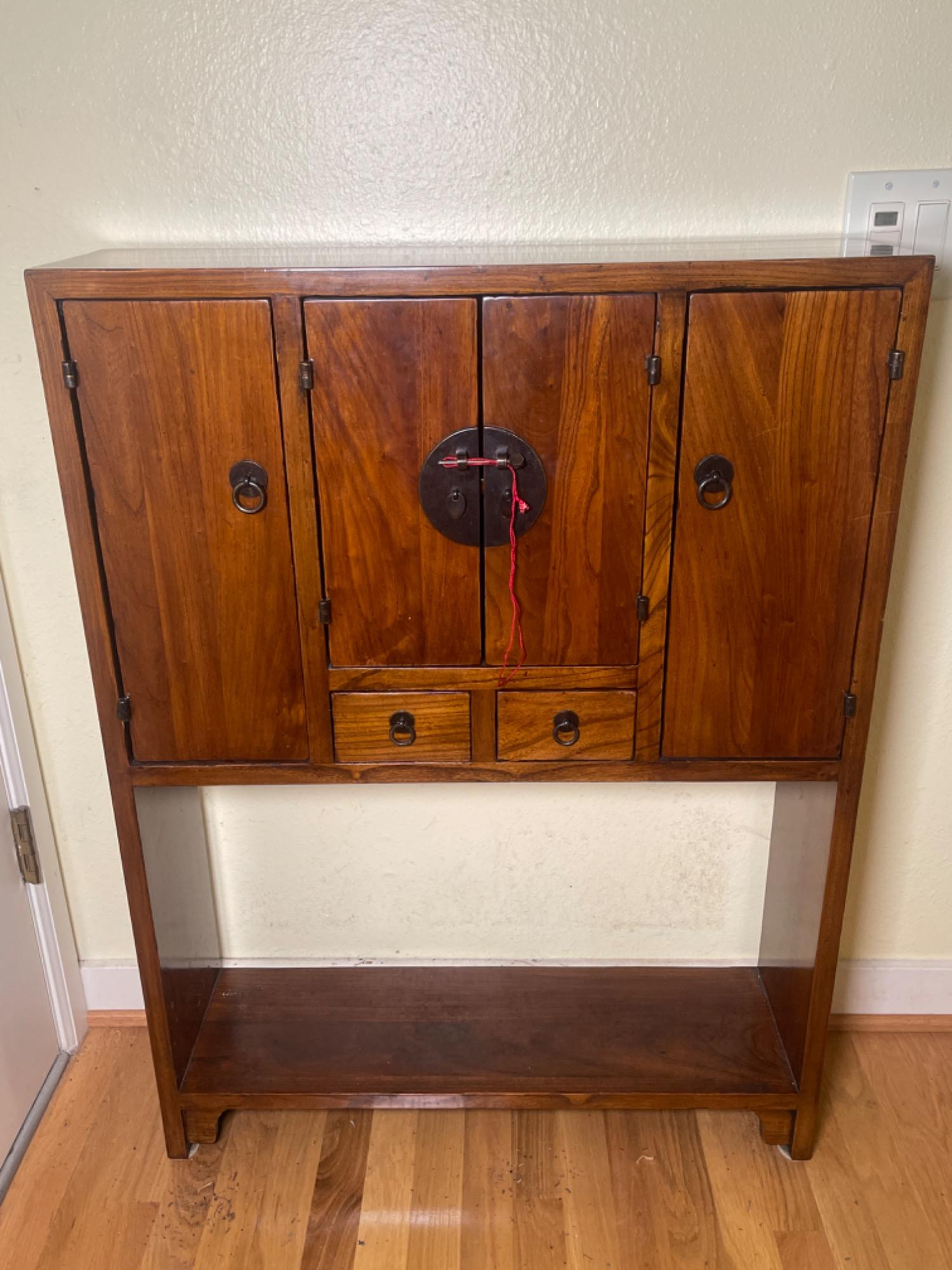 Vintage Tansu Cabinet – Handcrafted Wooden Japanese Style Storage Add a touch of Japanese-inspired craftsmanship to your home with this vintage tansu cabinet, a beautifully designed piece that seamlessly blends functionality with timeless style. This solid wood storage cabinet features a warm natural finish, accented by aged hardware and traditional ring pulls. Condition: Scuffs, scratches and stains are all present from use. Please see photos.
