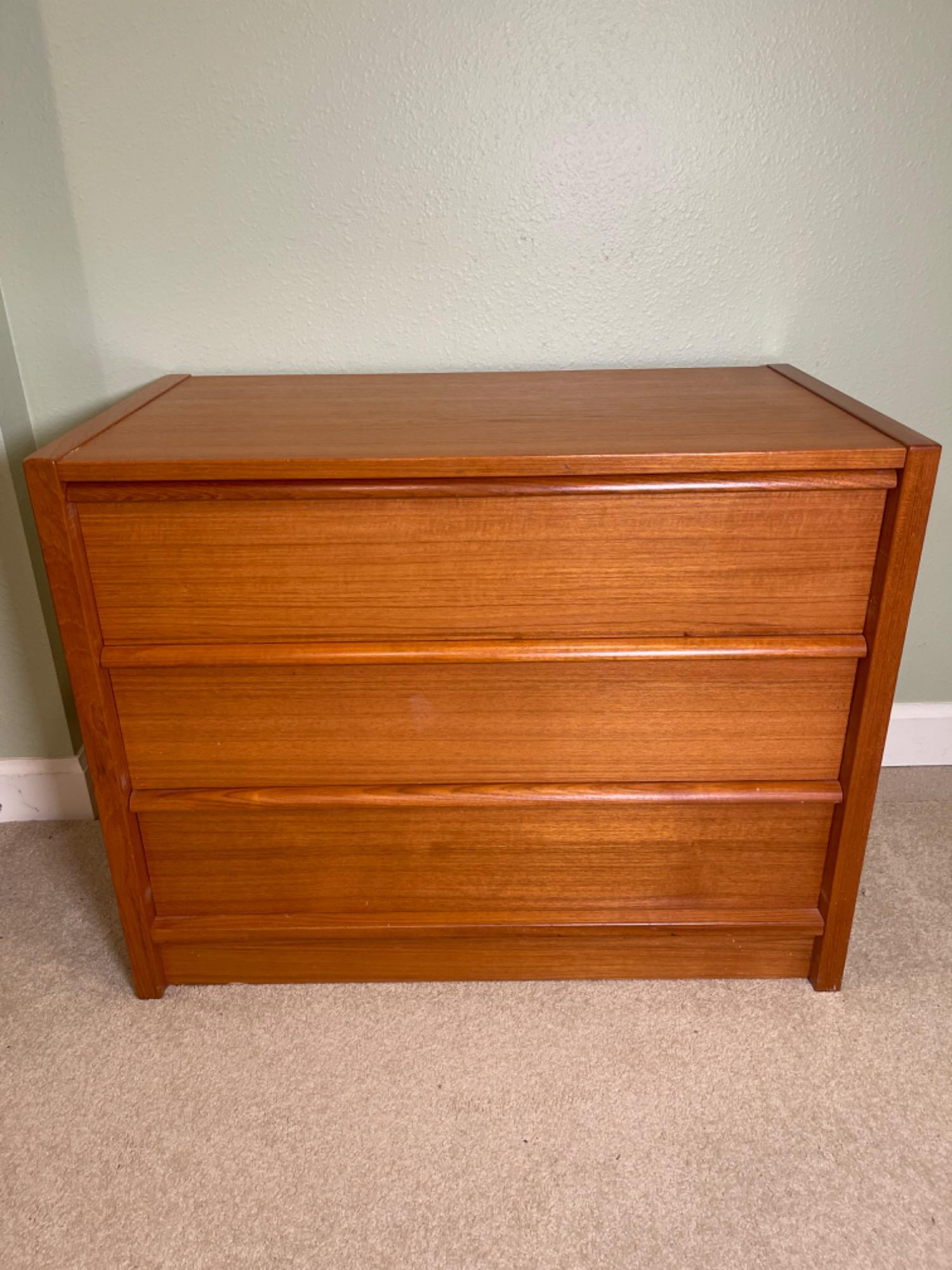 Vintage Teak Veneer 3-Drawer Dresser – Mid-Century Modern Style This vintage teak-veneered dresser embodies the timeless elegance of mid-century modern design, featuring a sleek, minimalist silhouette with integrated drawer pulls. With three spacious drawers, it provides both style and functionality, making it a perfect fit for bedrooms, living spaces, or offices. Condition: