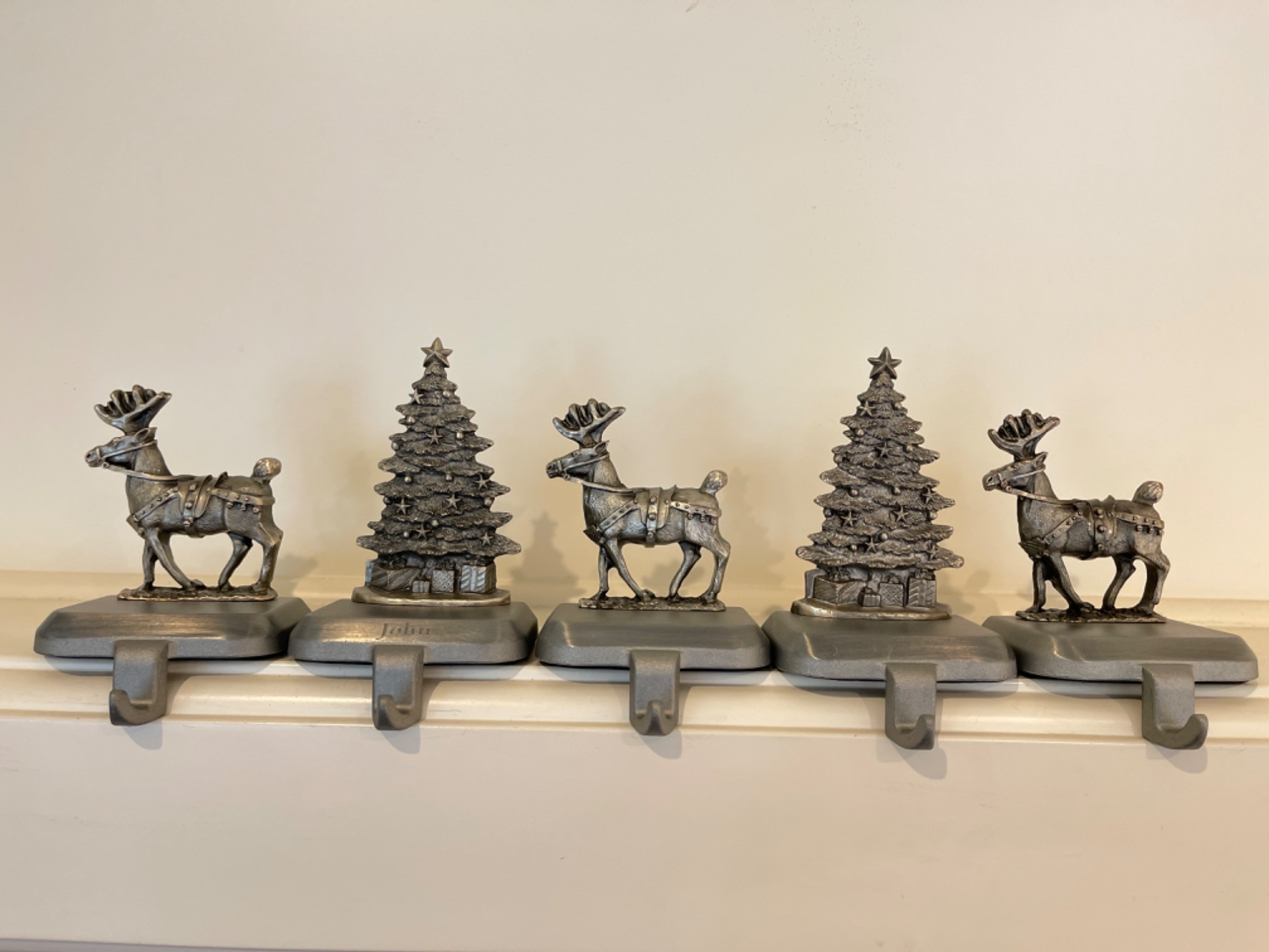 Set of Five Weighted Stocking Hangers – Reindeer & Christmas Tree Design One of the Christmas Trees have the name "John" inscribed on it. Add a festive touch to your holiday décor with this charming set of five weighted stocking holders. Designed with intricate detailing, this set includes three reindeer and two Christmas trees, each crafted in a beautiful antique silver-tone finish. Sizes: 4.5" - 5.25” H