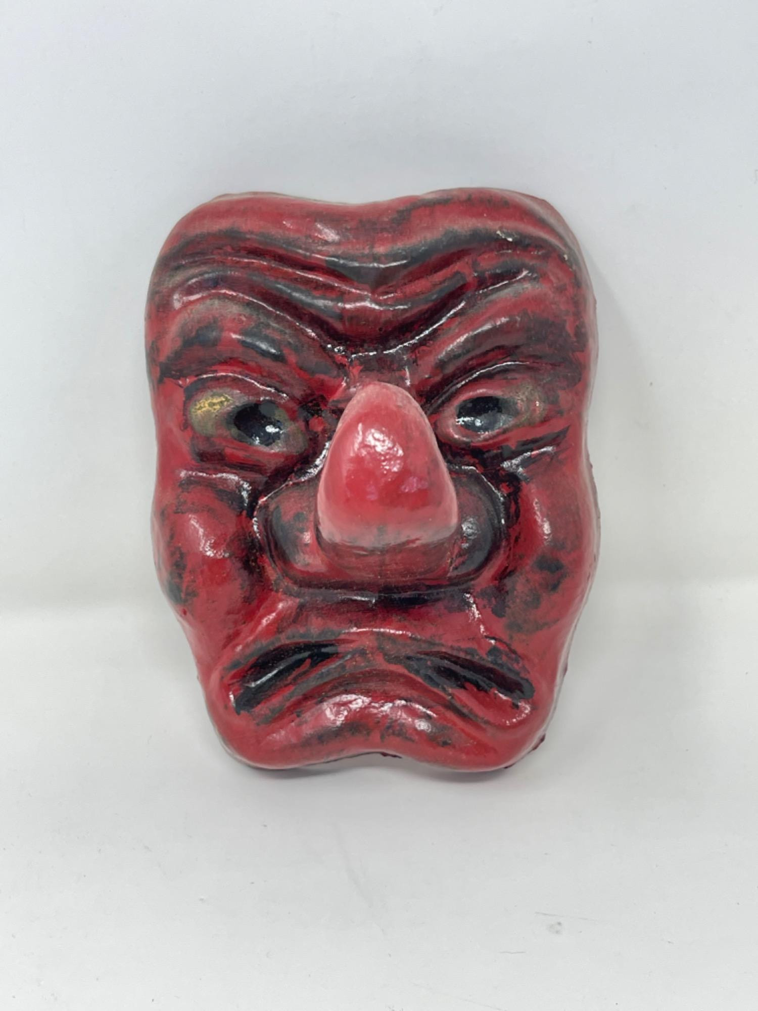 Handcrafted Papier-Mâché Tengu Wall Hanging Décor Add a bold and mythical touch to your space with this striking handcrafted papier-mâché Tengu mask wall hanging. Inspired by traditional Japanese folklore, this expressive red-faced figure embodies strength, mysticism, and legend. Condition: Very dusty