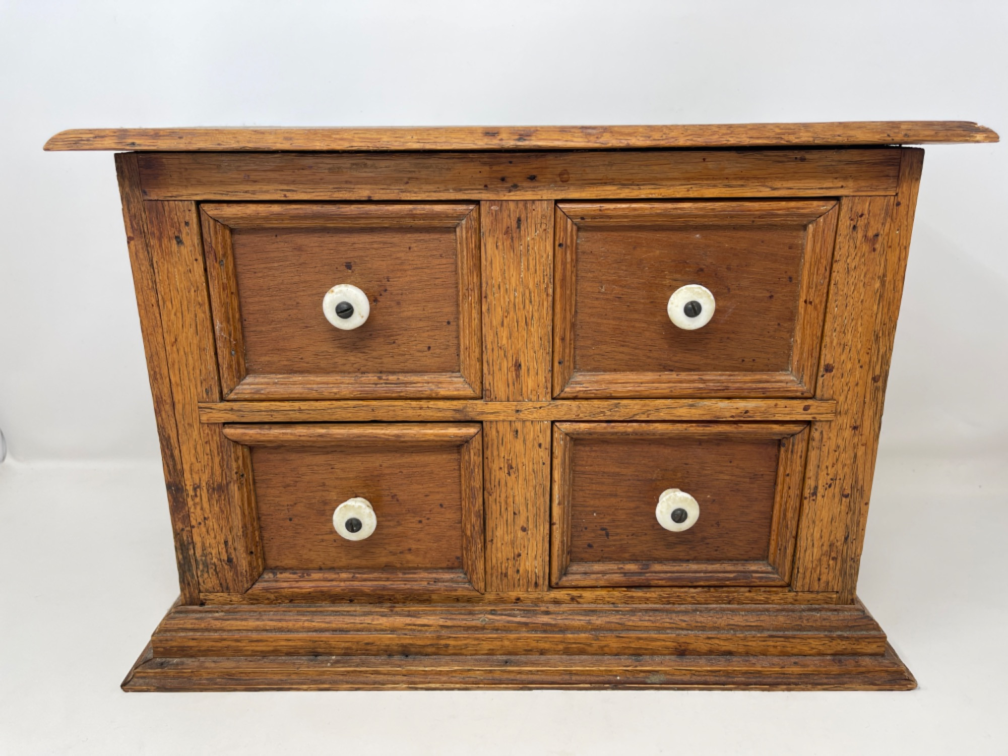 Antique Wooden Jewelry or Sewing Box This charming antique wooden box features four small drawers, making it ideal for storing jewelry, sewing notions, or keepsakes. With its warm aged patina, hand-crafted details, and delicate cream knobs, this piece exudes vintage character and timeless appeal. Condition: - Well-worn antique condition with visible scuffs, scratches, and age-related imperfections, adding to its charm. - Drawers function properly, making it both a decorative and practical piece.