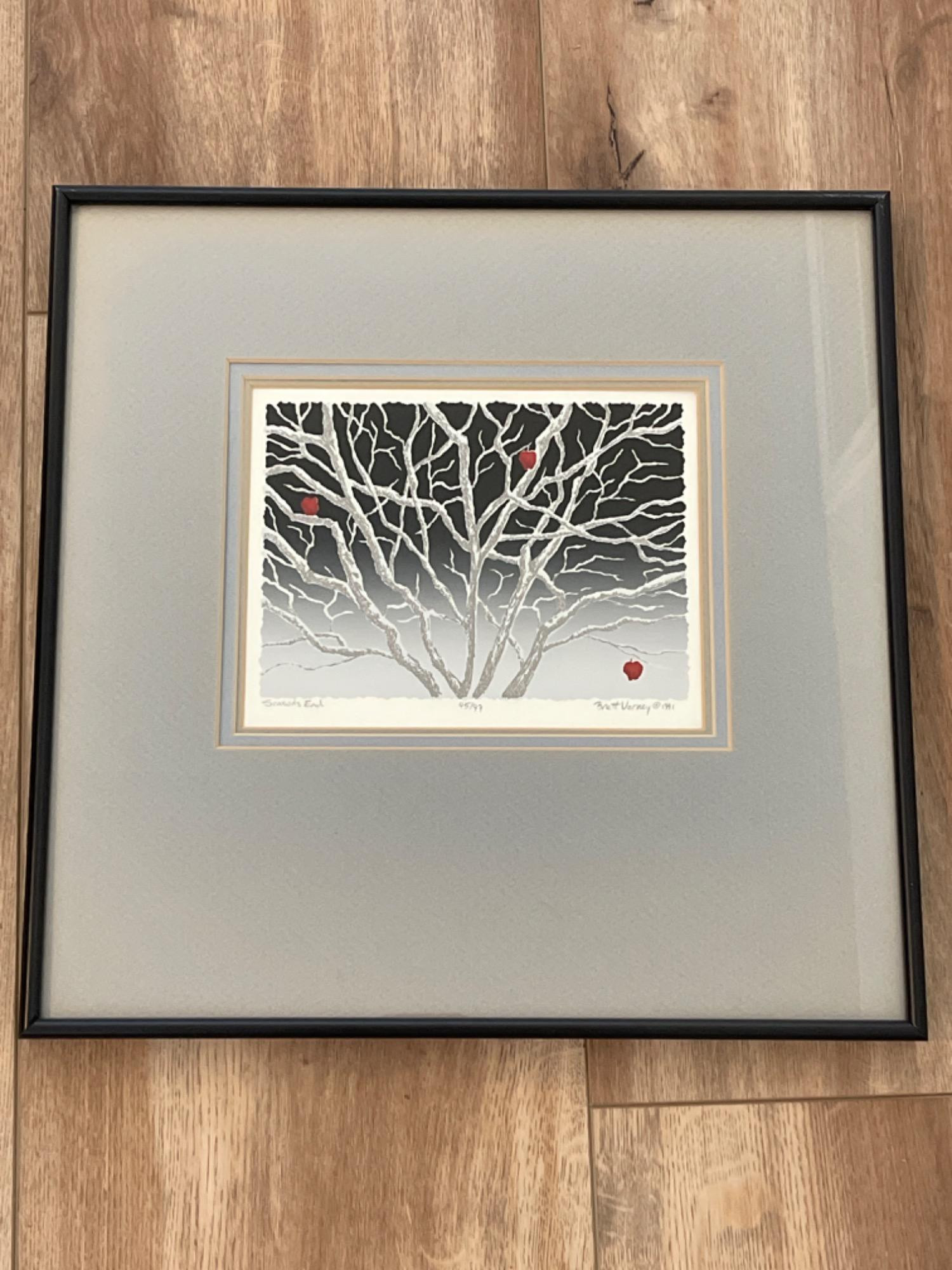 This stunning hand-pulled serigraph by renowned artist Brett Varney is a limited edition piece titled "Season’s End." Featuring a striking depiction of a leafless tree with a few remaining red apples against a moody gradient background, this piece captures the quiet beauty of nature in transition. The intricate details of the tree branches contrast beautifully with the soft, fading tones of the sky, creating a mesmerizing visual effect. Condition: - Minor scuffs and scratches to frame. - Minor staining on interior of frame. See photos.