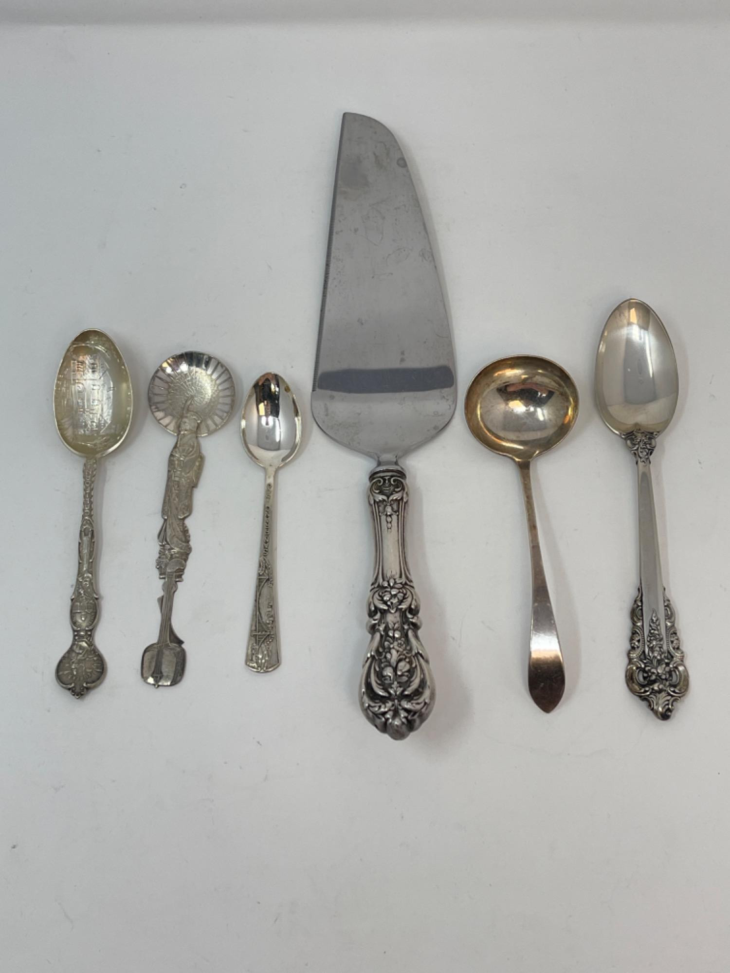Vintage Sterling Silver Flatware & Serving Assortment This vintage sterling silver assortment features an elegant mix of collectible spoons and serving utensils, showcasing intricate craftsmanship and timeless appeal. The collection includes five fully sterling silver pieces and one sterling-handled serving spatula, each with unique designs that make them perfect for display, use, or as an addition to any silver collection. Condition: All have staining and tarnishing. Please see photos. Spoons Collective Weight: 92g Serving Spatula (Sterling Handle ONLY): 106g
