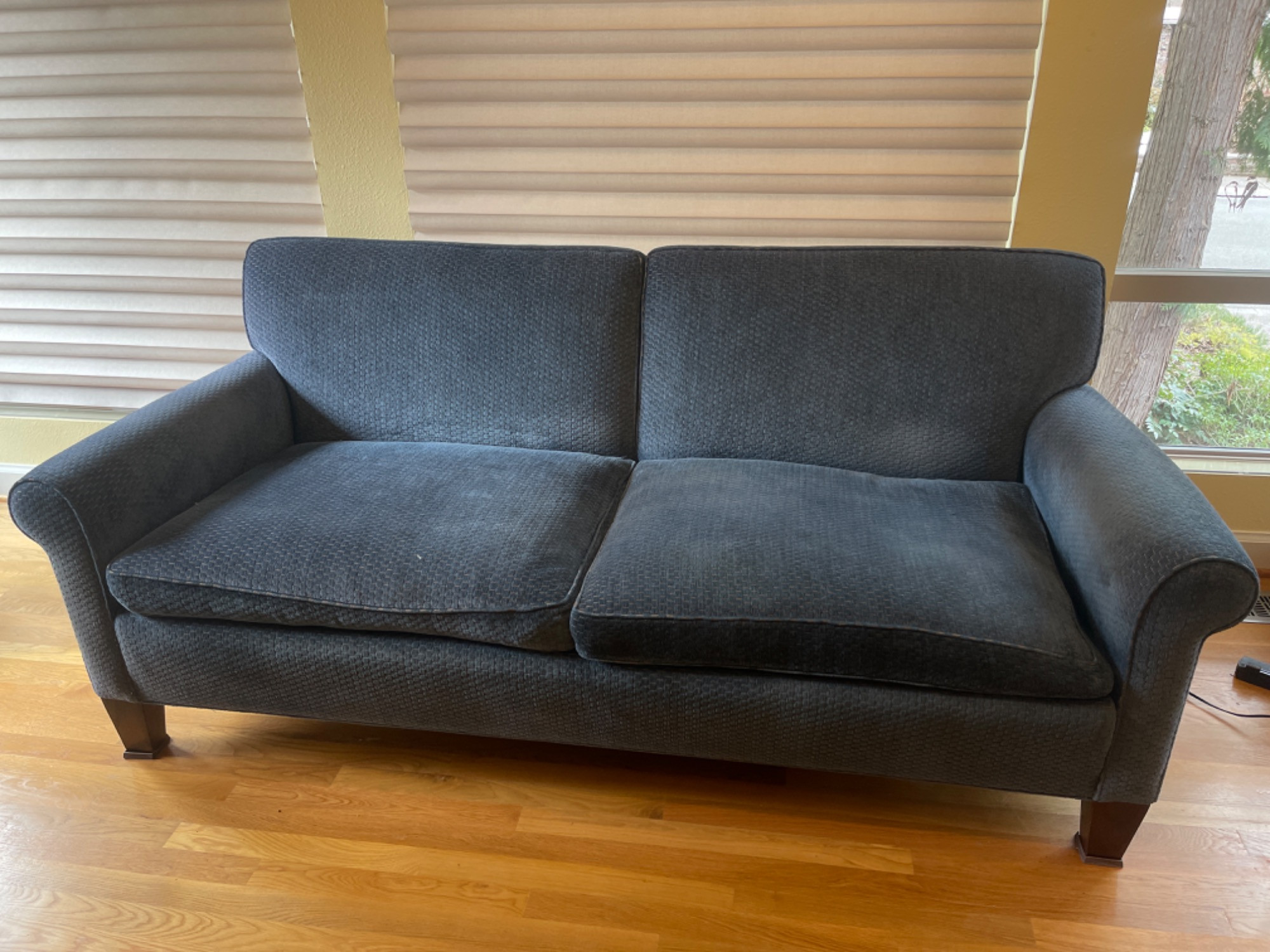 Classic Dark Blue Upholstered Sofa – Comfortable & Stylish Upgrade your living space with this classic dark blue upholstered sofa, featuring a woven textured fabric with subtle contrast stitching. Designed for both style and comfort, this two-seat sofa offers plush, removable seat and back cushions, gently rolled arms, and sturdy wooden legs for timeless appeal Condition: Pre-owned with some visible wear, including minor fabric wear and slight cushion indentations (see photos for details)