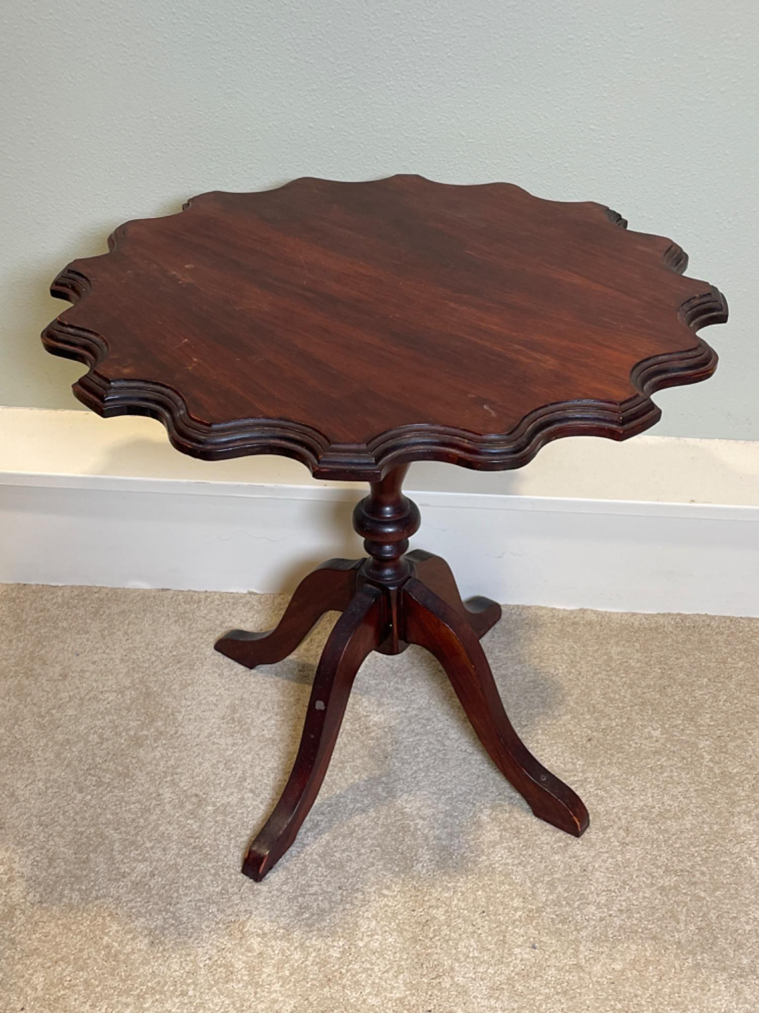 This vintage wooden side table features an elegant scalloped-edge top, supported by a gracefully turned pedestal base with three curved legs. With its rich, dark wood finish and timeless craftsmanship, this piece adds a touch of traditional charm to any space. Condition: Pre-owned with visible wear, including scuffs, scratches, and minor finish imperfections (see photos for details)