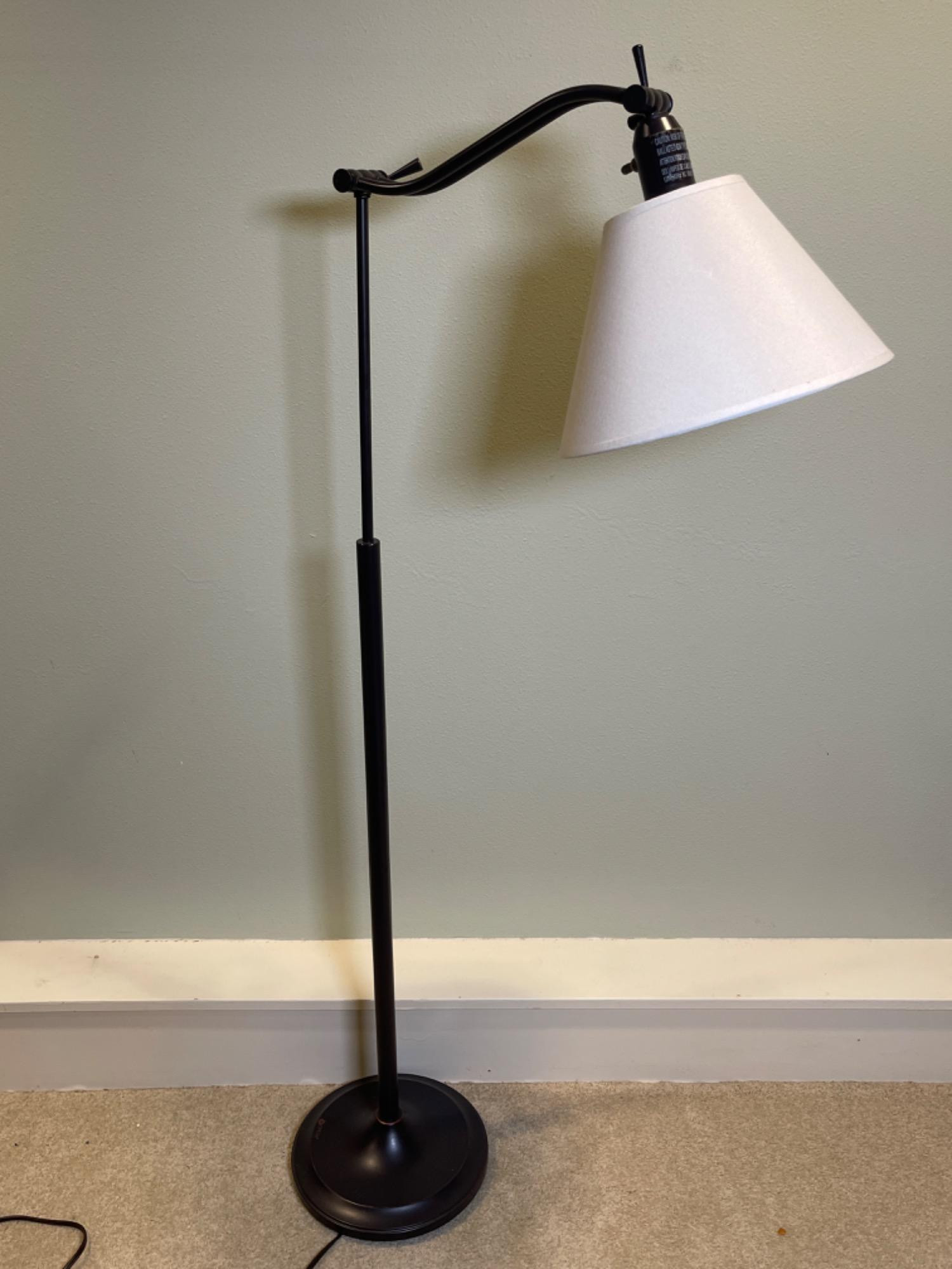 OttLite adjustable floor lamp with a sleek black metal design and a conical shade. Ideal for task lighting, reading, or crafting with its flexible arm for directing light where needed.