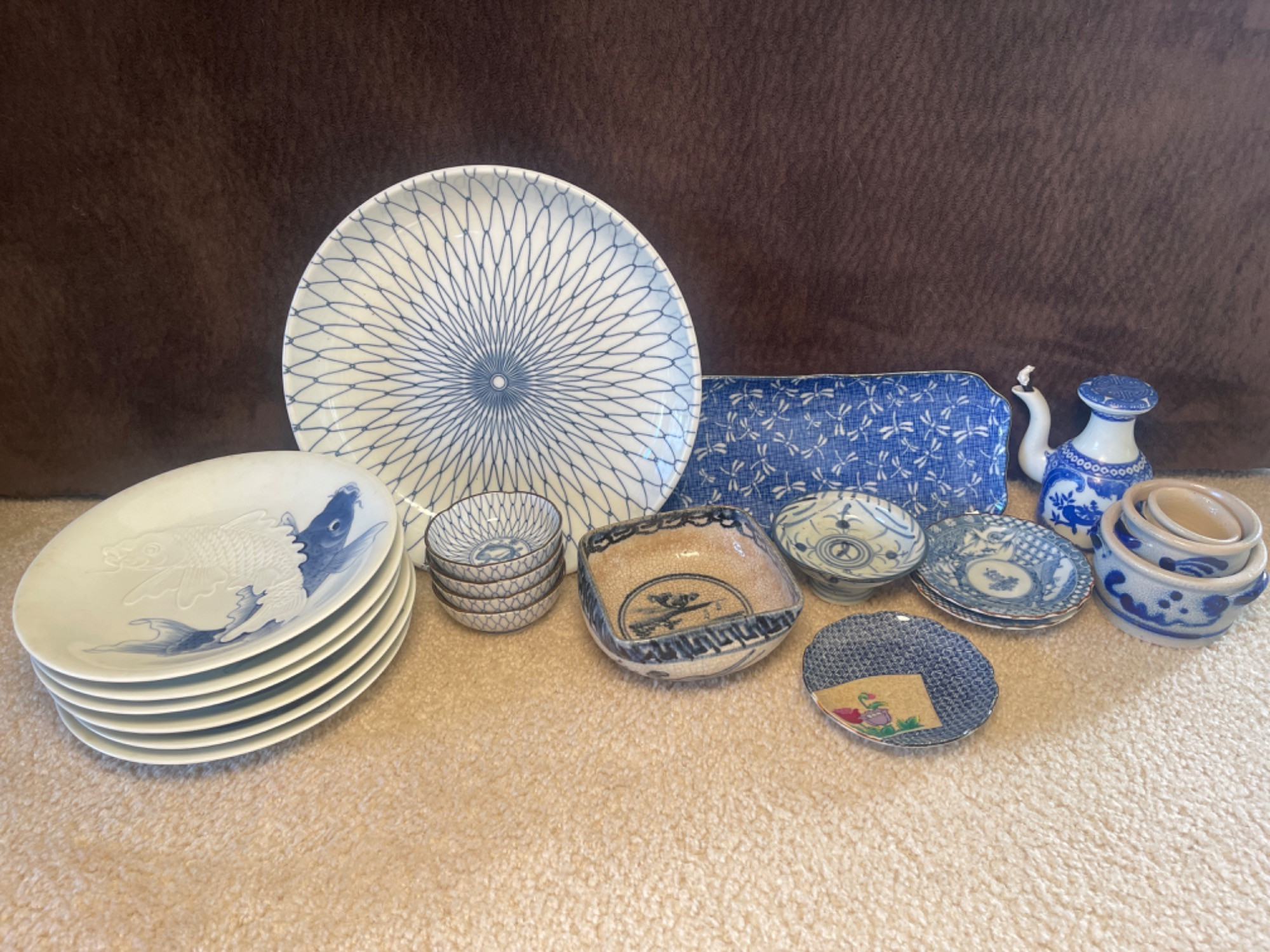 Large Assortment of Vintage Blue and White Japanese Dishes