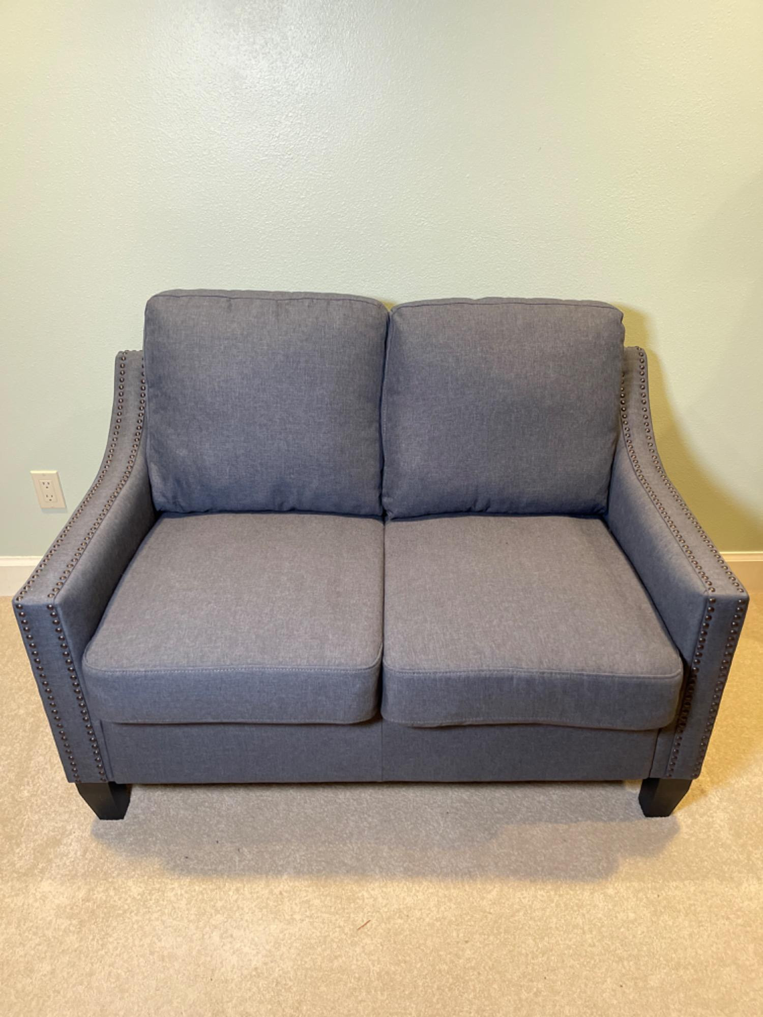 Stylish and comfortable loveseat featuring a sleek design with decorative nailhead trim along the arms. The deep blue-gray upholstery complements a variety of interiors, while the plush cushions provide excellent support.