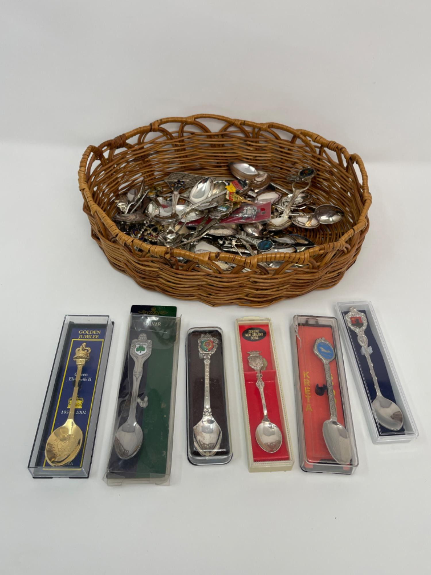 Diverse collection of souvenir and commemorative collector's spoons, featuring a variety of designs, locations, and themes. Condition: Some have tarnishing.