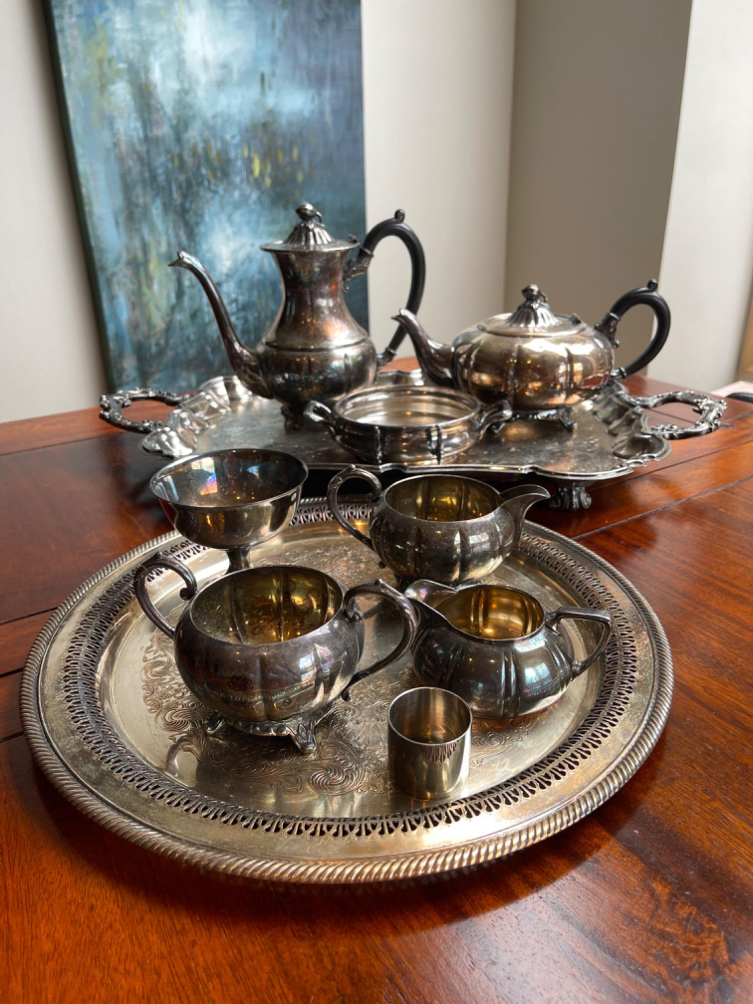 A stunning collection of vintage silverplate, featuring an elegant assortment of serving and tea pieces. The set includes pieces from notable makers such as Viking and Reed & Barton, showcasing classic ornate designs and timeless appeal.