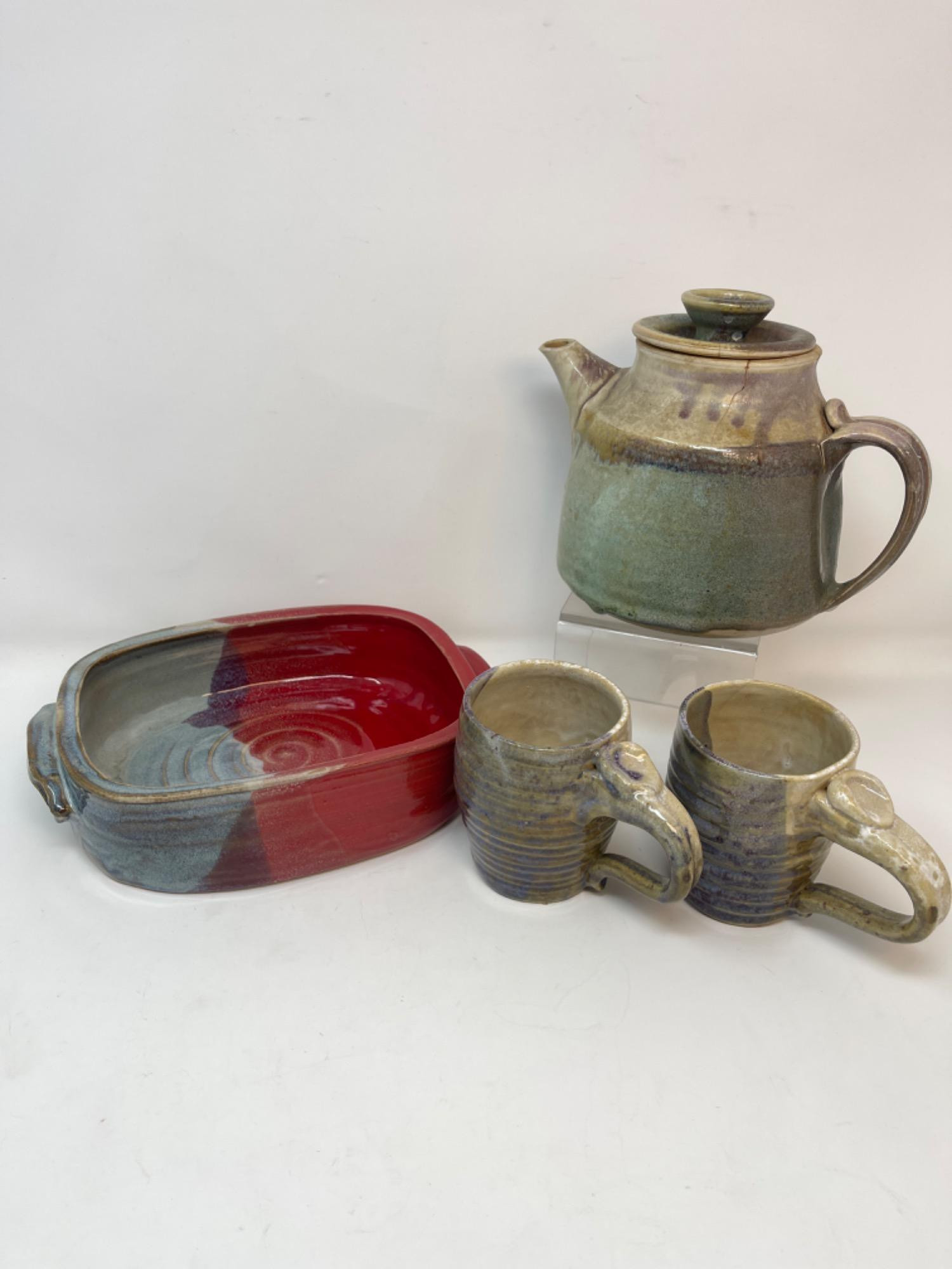 A unique assortment of handmade pottery, featuring a rustic glazed teapot, two matching mugs, and a red-and-blue baking dish. Beautiful earthy tones and organic textures make this a lovely artisan collection.