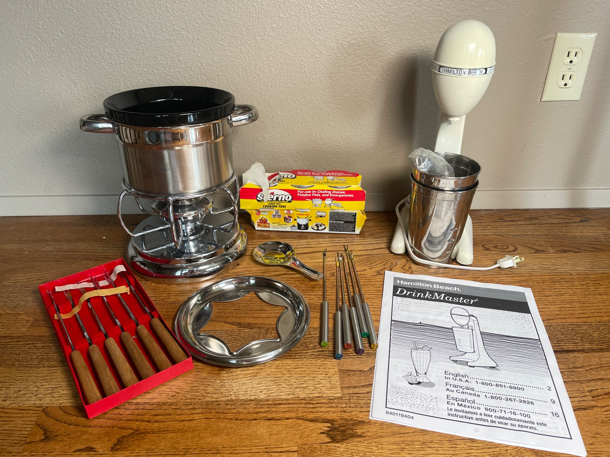 This set includes a classic stainless steel fondue pot with a black ceramic insert, complete with a stand and wooden-handled forks—perfect for entertaining or indulging in a cozy fondue night. Also included is a vintage Hamilton Beach DrinkMaster, a retro-style milkshake mixer that adds a nostalgic touch to any kitchen.