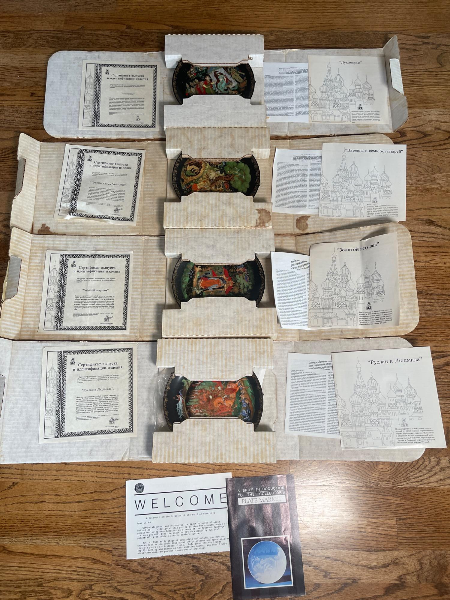 Lomonosov Russian Legends Collector Plates – Complete Set with Original Boxes and COA's A captivating collection of Lomonosov Russian Legends collector plates, each meticulously crafted by the esteemed Lomonosov Porcelain Factory. These plates showcase intricate designs inspired by Russian folklore, adorned with rich colors and gold accents. Each plate is accompanied by its original box and Certificate of Authenticity, ensuring its provenance and value. Condition: