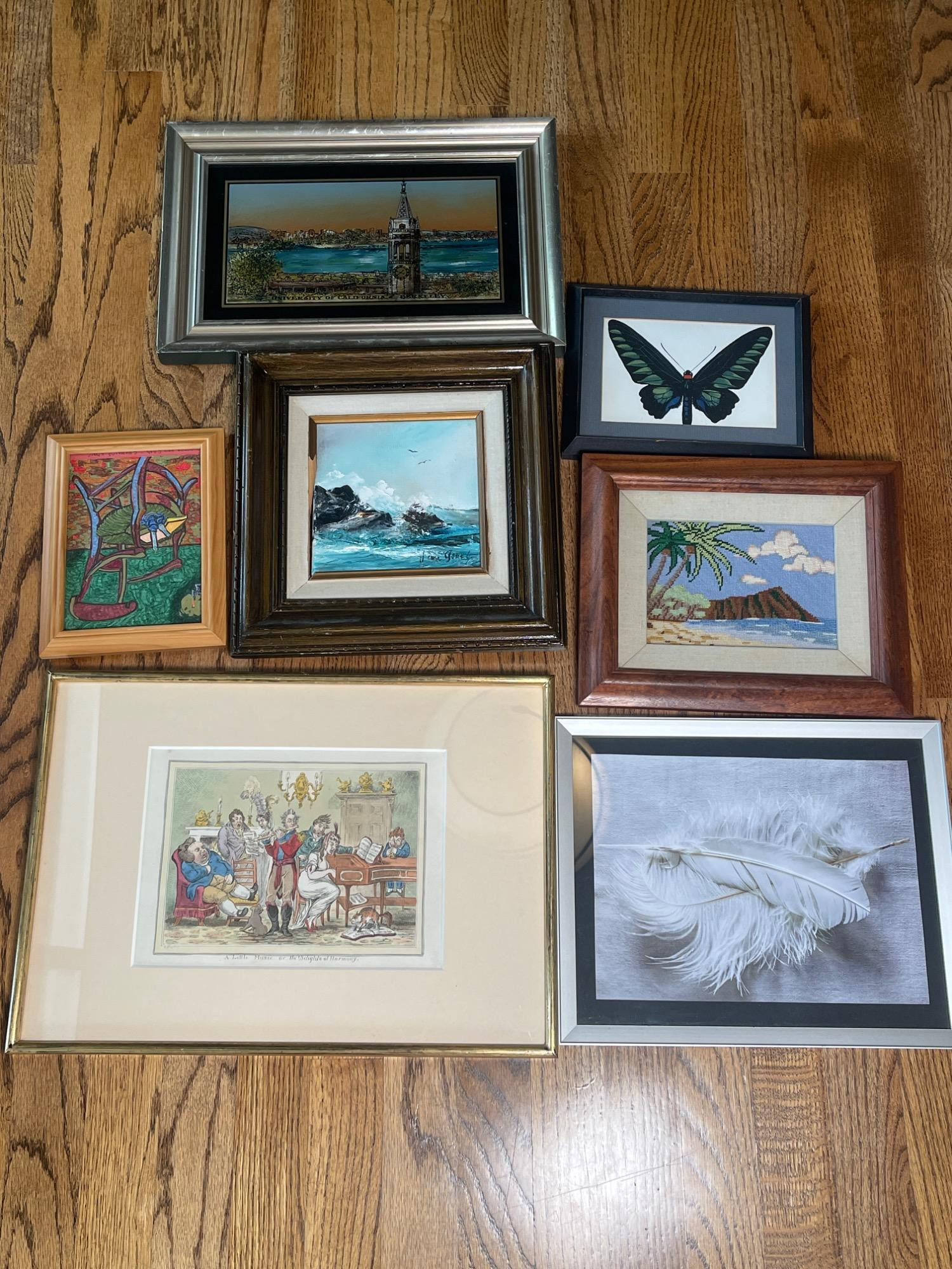 A diverse collection of framed artwork, including original paintings, prints, and a Hawaiian-themed stitching art piece. This set features a mix of styles and subjects, ranging from landscapes and abstract designs to nature and historical prints. The variety makes this an excellent selection for collectors, decorators, or those looking to refresh their wall art.