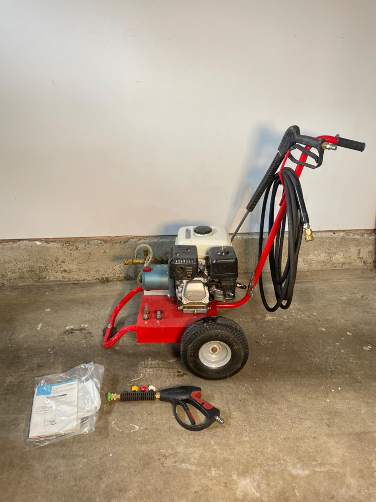 This heavy-duty gas-powered pressure washer is equipped with a reliable Honda GX160 5.5 HP engine and a CAT Pumps 2DX30GNS triplex pump, known for its durability and high performance. Designed for tackling tough cleaning tasks, it comes mounted on a sturdy red steel frame with large pneumatic tires for easy maneuverability. The washer includes a spray gun with multiple nozzles for versatile cleaning applications.