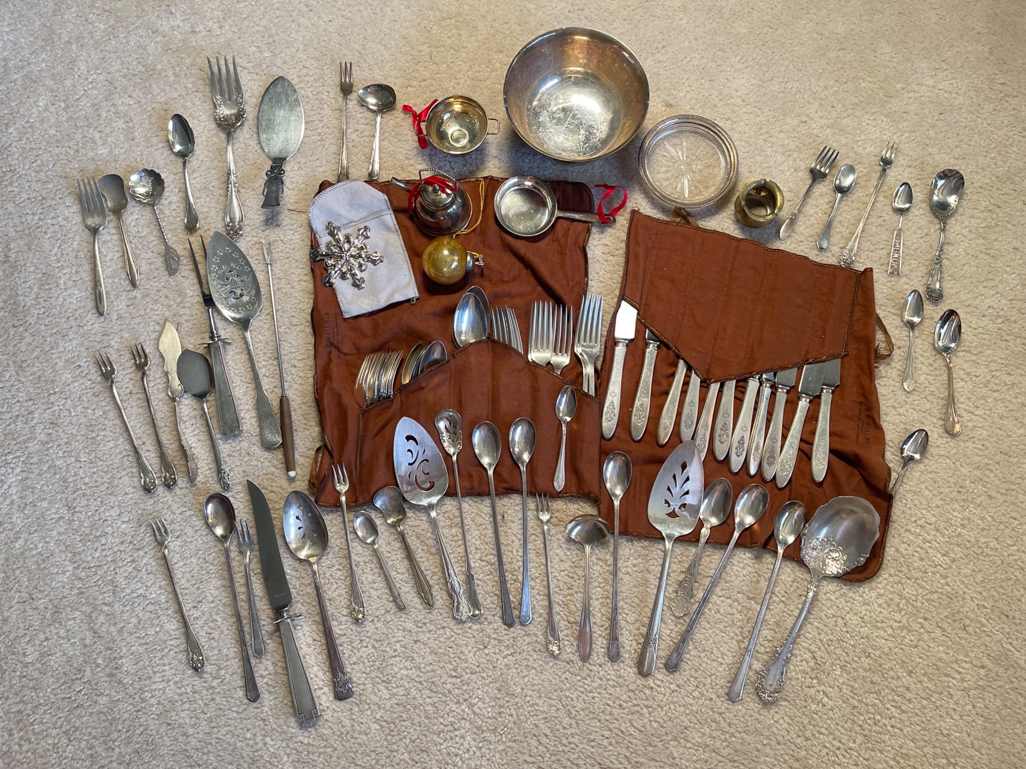 Assorted Vintage Silverware and Serveware Silver-rimmed coaster is sterling silver. Condition: All have some tarnishing, but are in good used condition. Measurements: Smallest: 4" L Largest: 10.5" L