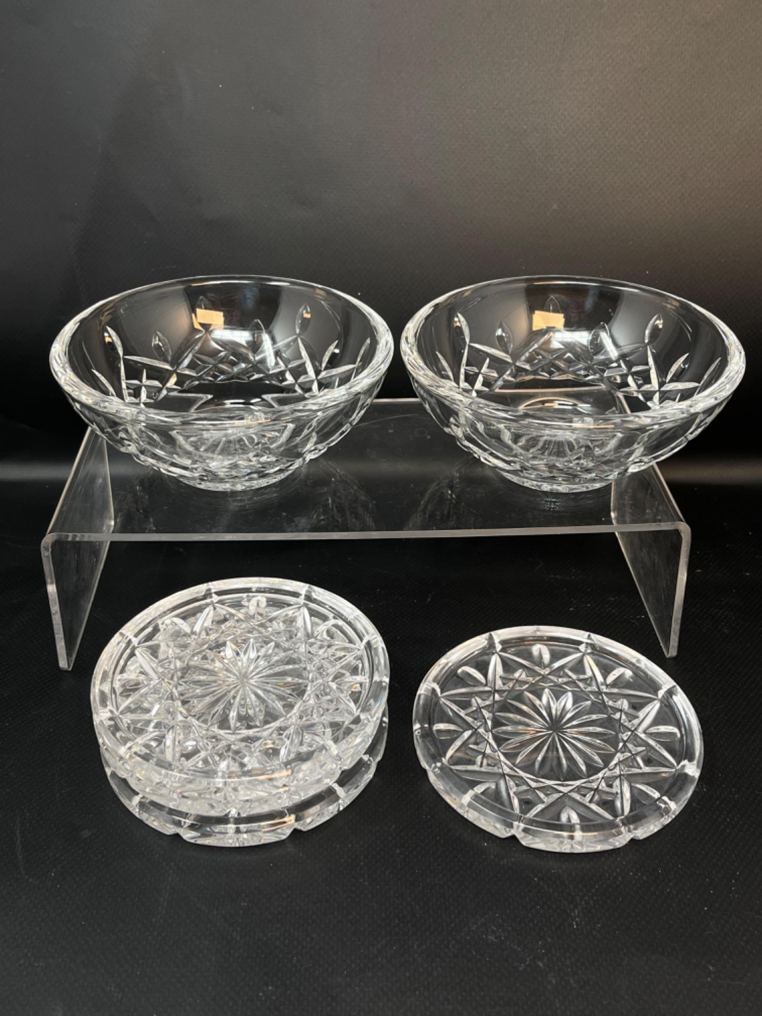 Elegant Waterford crystal set featuring two intricately cut bowls and matching coasters. The bowls showcase a brilliant cut design, perfect for serving or display, while the coasters complement them with a similar pattern. A timeless addition to any collection.