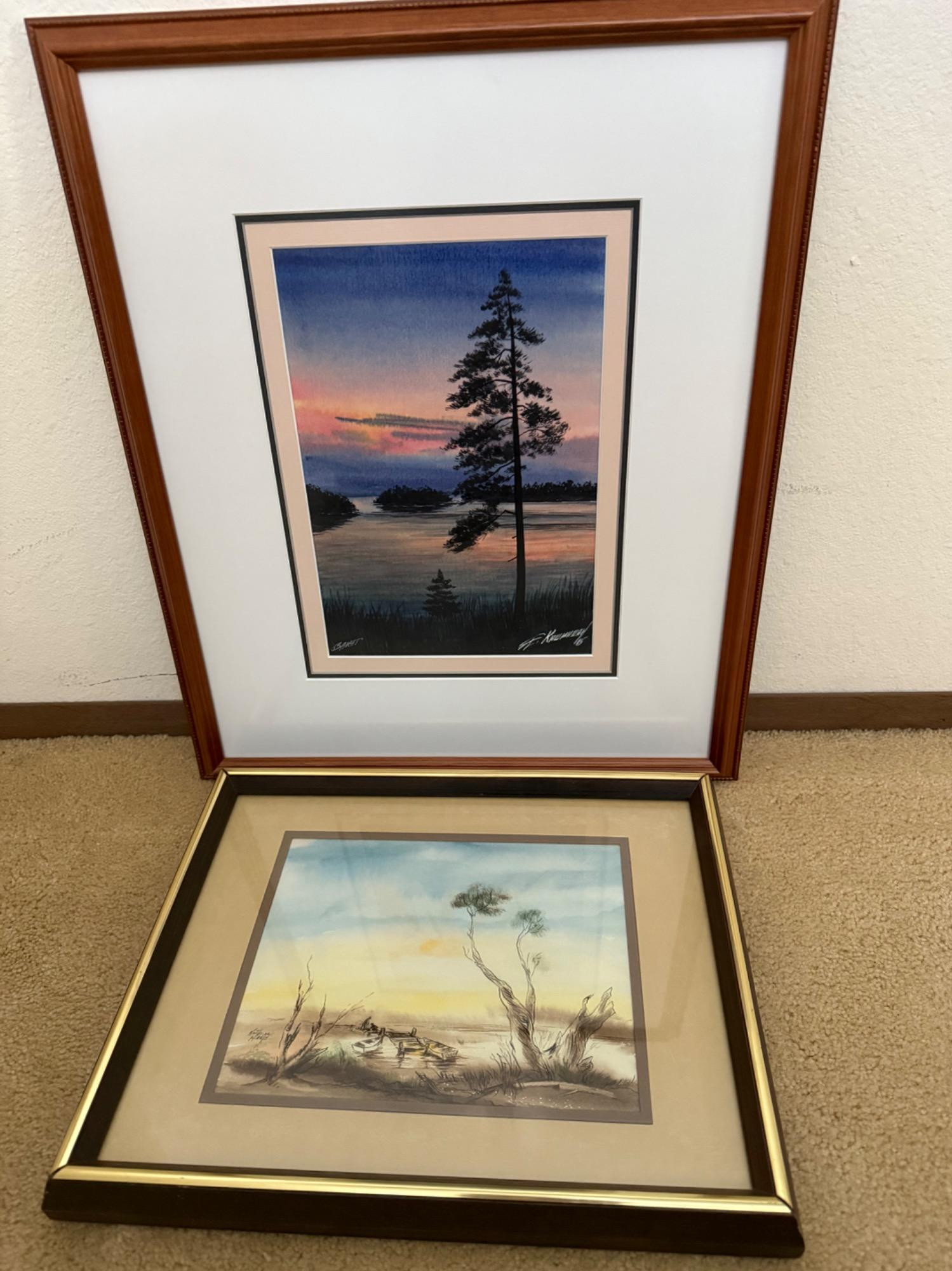 Signed Kathryn Kaye Watercolor Paintings and other – Framed (21” x 17” & 15” x 12”). Signed watercolor landscape paintings by Kathryn Kaye beautifully captures tranquil natural scenes with soft sky gradients, delicate trees, and peaceful water reflections. Kaye’s masterful brushwork and use of atmospheric tones create a calming, timeless appeal. Other artist signed. Please see pictures. Appears to be a watercolor. The larger piece measures 21” tall x 17” wide, while the smaller piece is 15” tall x 12” wide. Both are professionally framed and matted, enhancing their presentation and making them ready to hang. The elegant frames complement the artwork’s serene color palette, perfect for home decor, a cabin retreat, or an art collection focused on nature-inspired themes.