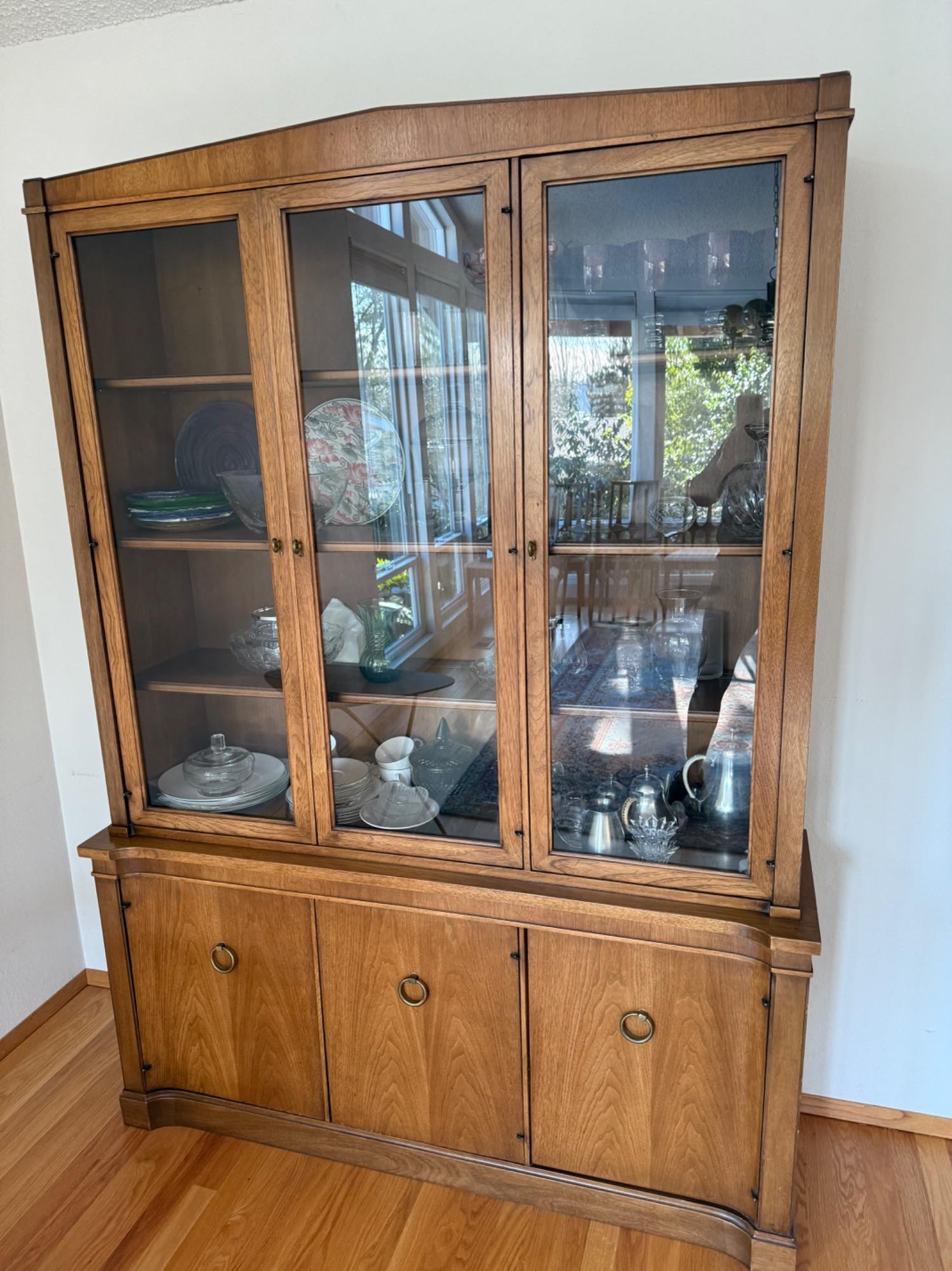 Wooden Glass-Front Cabinet Hutch – 56”W x 16.5”D x 78”T This beautiful wooden cabinet hutch features glass-paneled doors on the upper section, perfect for displaying fine china, glassware, or collectibles. The lower base offers enclosed storage with cabinet doors and drawers, providing ample space for organization. Measuring 56 inches wide, 16.5 inches deep, and 78 inches tall, this hutch is both functional and stylish. Contents not included—hutch only. Bidding on this lot is an agreement that: (1.) You will have 2 capable, able-bodied persons to lift and load at a minimum. (2.) You will bring a hand truck and/or any other tools needed to remove this item. If these steps are not followed your item will be forfeited and no refund given.