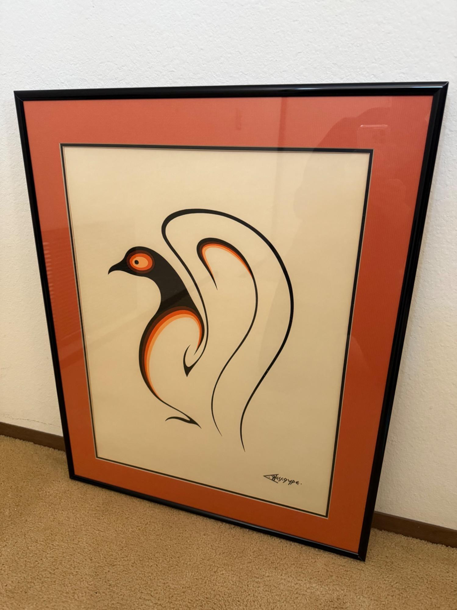 This striking 1978 framed print by renowned Indigenous artist Clarence Wescoupe features a minimalist yet bold depiction of an orange and black bird, outlined in fluid, graceful lines. Wescoupe, known for his unique style blending contemporary and traditional Indigenous art, captures the essence of movement and nature in this work.