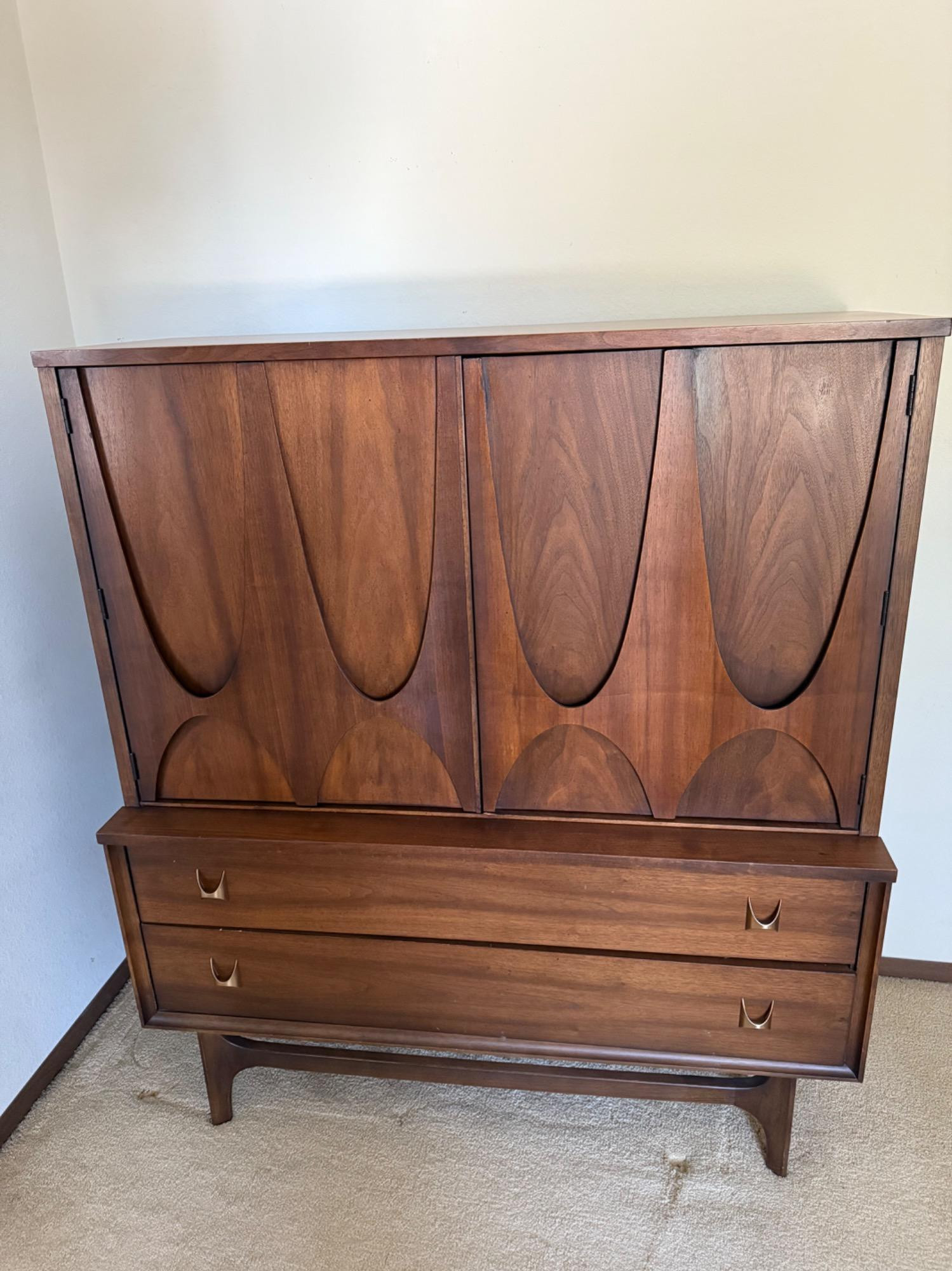 Broyhill Brasilia Sculpted Walnut Dresser/Gentleman's Chest. Measures-Height: 49.75 in (126.37 cm)Width: 44 in (111.76 cm)Depth: 19 in (48.26 cm) This exceptional dresser or gentleman's chest was designed and made in the 1960s. Taking inspiration from gothic architecture, the chest design cues like sculptured walnut door pulls, reminiscent of gothic arches that reach into the sky, and arched drawer pulls and a arched base. However, this dresser is Mid-Century at its core, with the main body of the dresser being composed of two rectangular shapes. The doors on top open to reveal shelving on the left and 4 drawers on the right, and bottom features drawers that span the entire width of the piece, each sporting two solid brass arched pulls. This unit is set on a base with crossbars bridging between them to bring a sturdy feel to the design. Bidding on this lot is an agreement that: (1.) You will have 2 capable, able-bodied persons to lift and load at a minimum. (2.) You will bring a hand truck and/or any other tools needed to remove this item. If these steps are not followed your item will be forfeited and no refund given.