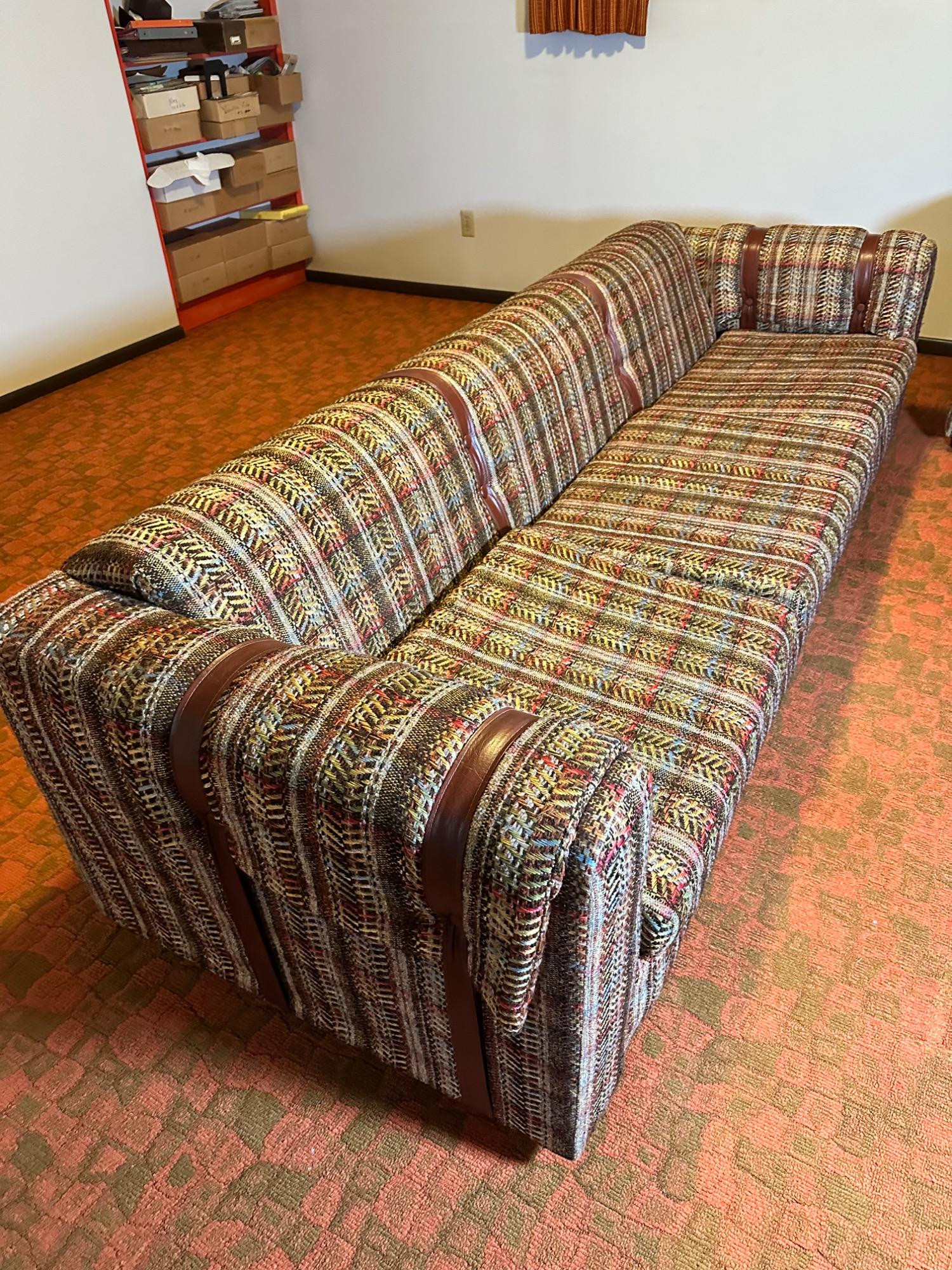 Vintage Style Sofa (91” x 33” D x 27” T) w/ Classic Plaid Upholstery vinyl straps with nailhead trim This vintage style sofa, measuring 91” W x 33” D x 27” T, offers a spacious and comfortable seating option with its timeless plaid upholstery in rich red, green, and brown tones. The sofa’s classic design complements the loveseat in Lot 66, making them a perfect pair for a coordinated living room or lounge area. With its sturdy frame and plush cushions, this sofa offers both style and comfort. Whether you’re furnishing a new space or looking to update your current one, this piece is ideal for creating a cohesive and welcoming environment. Bidding on this lot is an agreement that: (1.) You will have 2 capable, able-bodied persons to lift and load at a minimum. (2.) You will bring a hand truck and/or any other tools needed to remove this item. If these steps are not followed your item will be forfeited and no refund given.