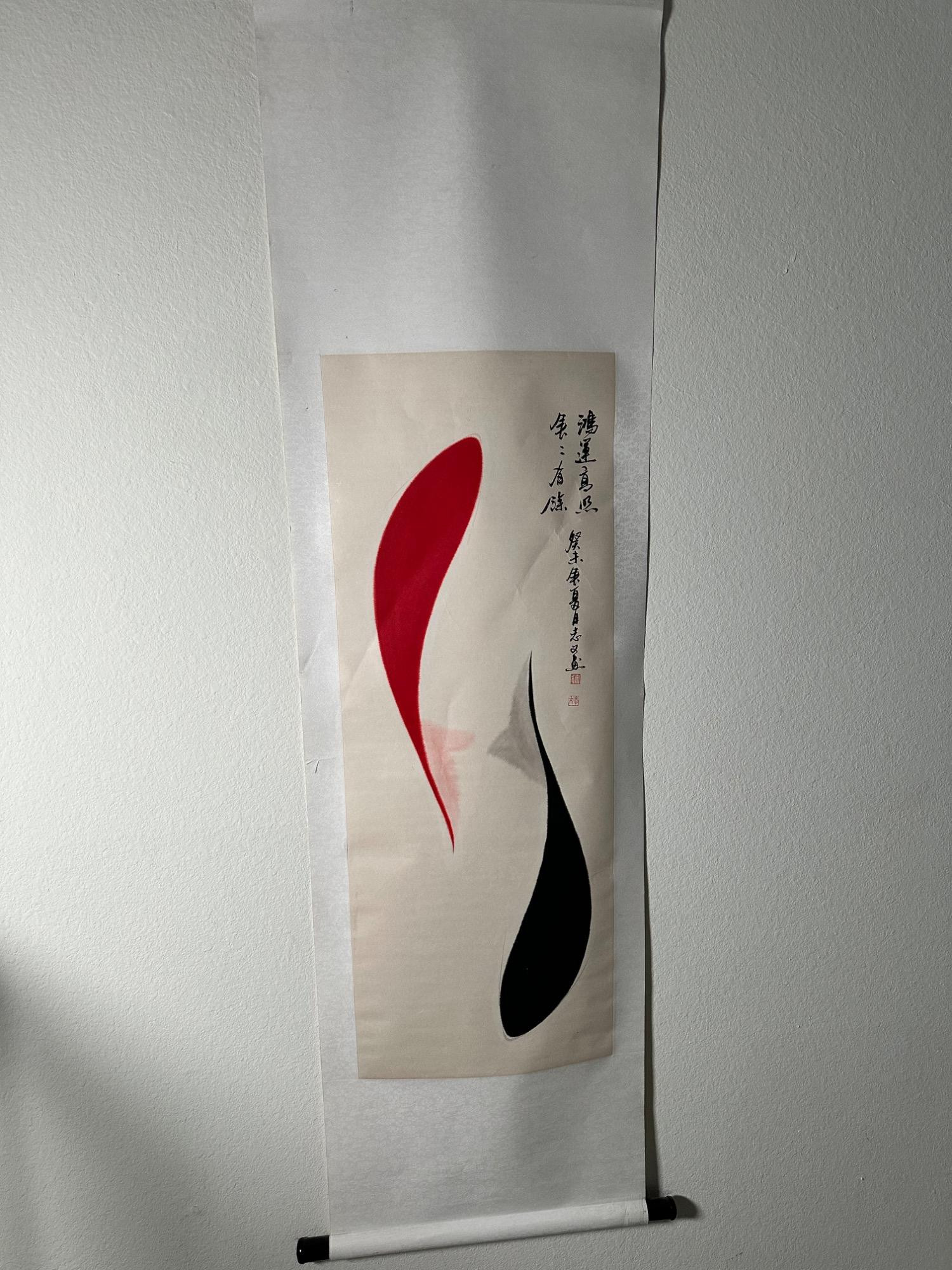 Yin Yang Koi Paper Scroll – Red & Black Koi, 36” Artwork This stunning Yin Yang Koi paper scroll features a beautifully painted red and black Koi that embodies balance and harmony. The intricate artwork measures approximately 36 inches in length, making it an eye-catching and serene addition to any space. The design emphasizes the graceful movement of the Koi fish, symbolizing peace and unity, while the bold color contrast adds a modern touch to the traditional art form.