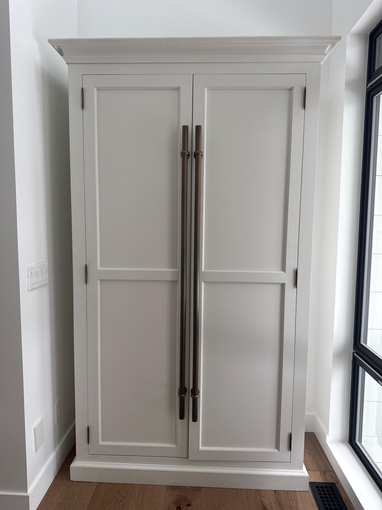 Discontinued French Panel Double Door Restoration Hardware - Armoire - Used as a Jacket Closet by the front door. Restoration Hardware White Cabinet Armoire - 91"x52"x21" Minor wear marks as seen in the photos. Retail (Discontinued) - $2500 Dimensions are approximate. Due to the size of the piece professional movers needed to remove item.