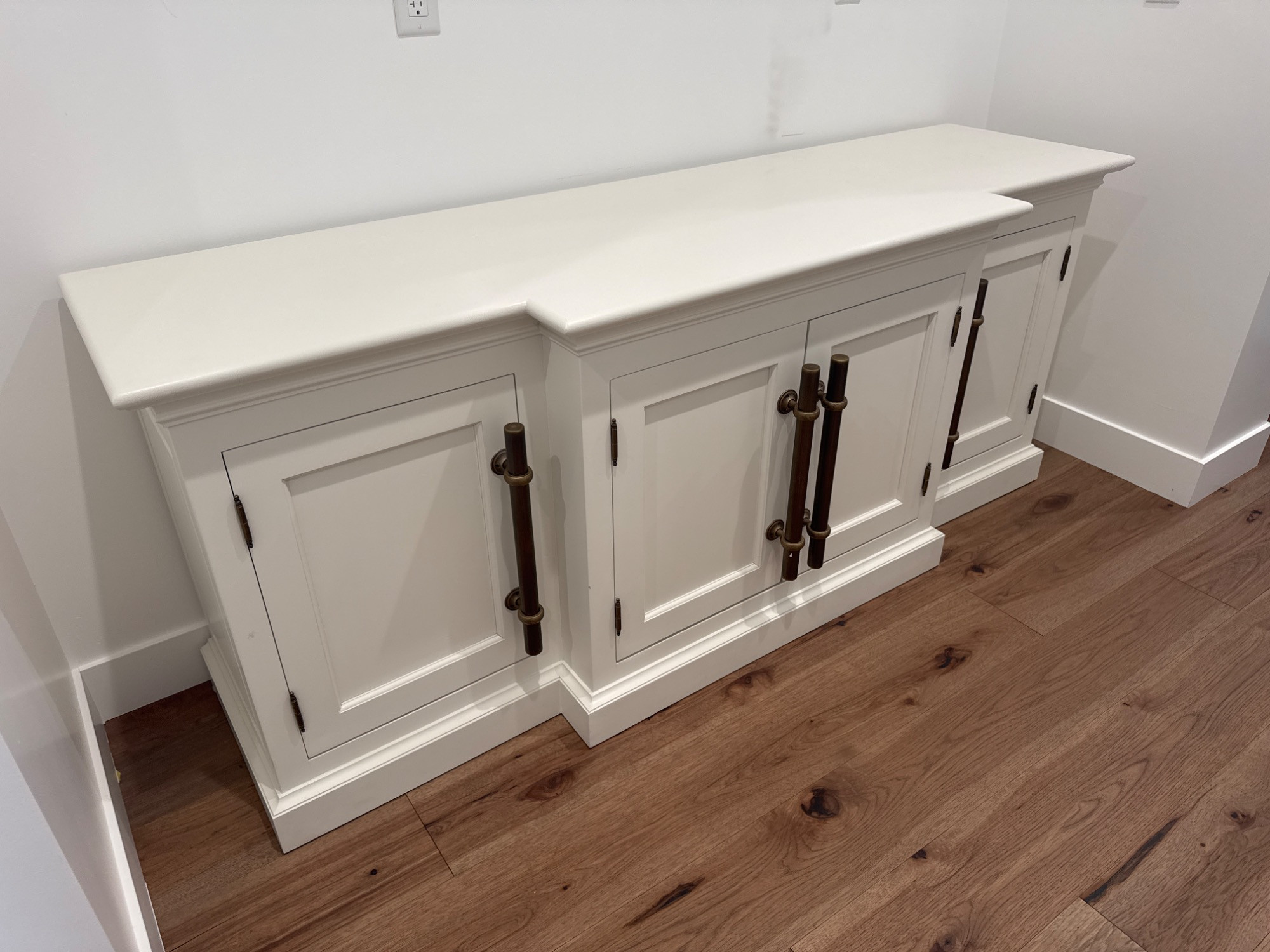Evoking the character of turn-of-the-century English cabinets used by shopkeepers to display and store their wares, Dutch artisan Theo Eichholtz designed with a brass bar handle, elegantly molded cornice and plinth-style base. Width: 80 inches, Height: 32 inches, Depth: 24 inches Retail (Discontinued) - $2500 Dimensions are approximate. Due to the size of the piece professional movers needed to remove item.