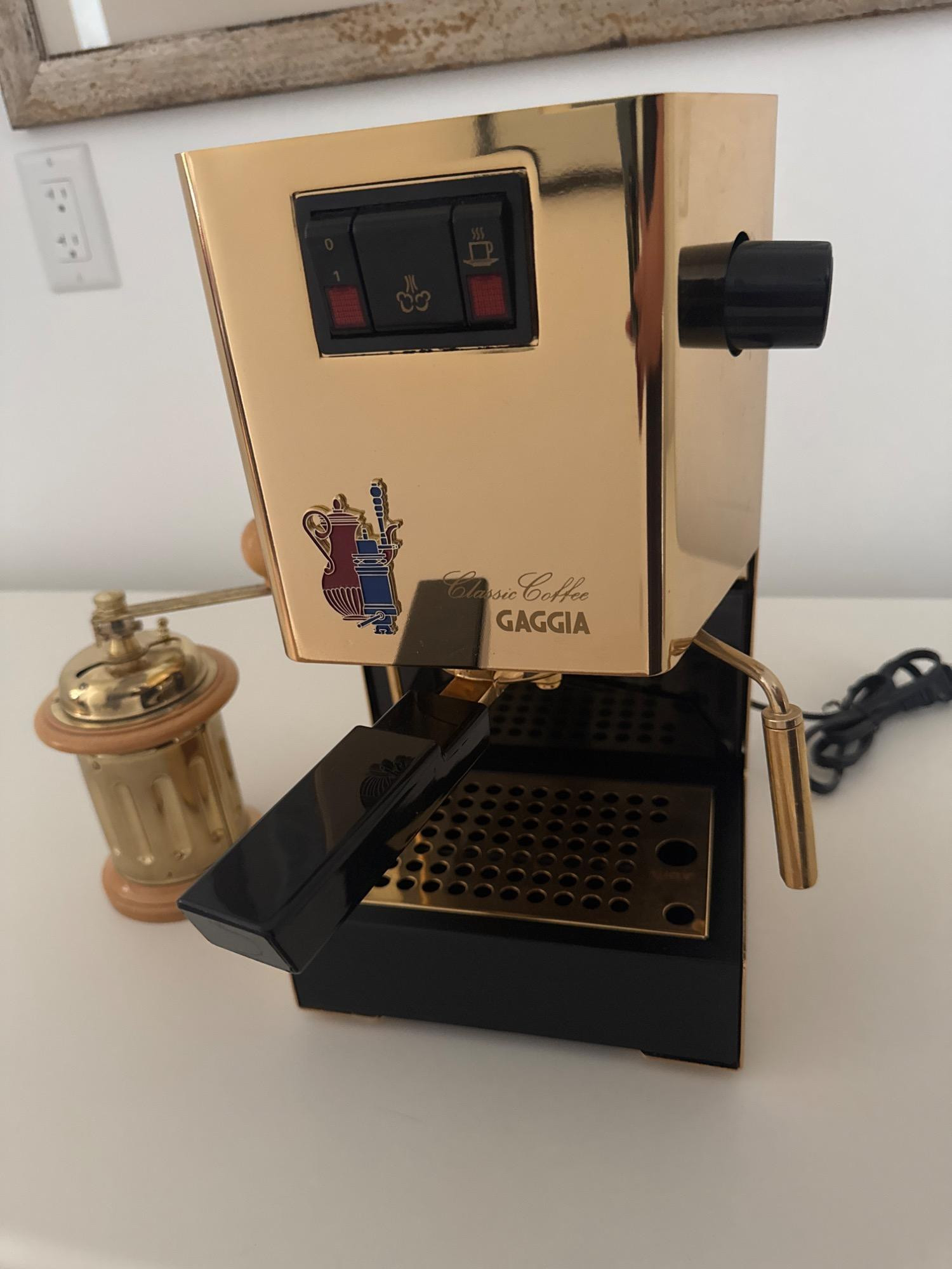 Gaggia Classic Max Gold Coffee Maker. Know worldwide for their quality, Gaggia, has a huge following. Many coffee connoisseurs add after market parts to their Gaggia Classics. This vintage coffee maker is in great condition and appear to be extremely well taken care of. There are a couple minor/small dents. Items seen in the photos are all included in the auction. The two mugs are Dean & Deluca mugs. An unbranded coffee grinder also included. Powers on but was not tested to make coffee. Coffee Maker appears to not have been used or it has been very well taken care of. Retail (Discontinued) - $650.00