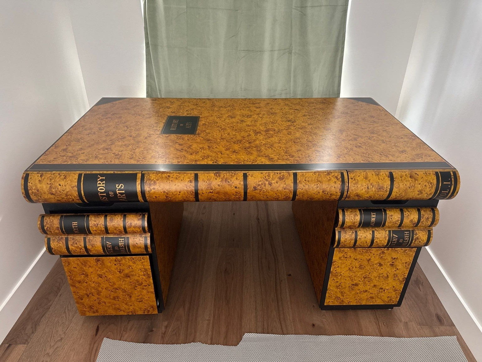 This is a unique book-themed writing desk designed to resemble a stack of antique books. The desk features intricate faux book detailing, including titles such as "History of Arts", giving it a vintage library or scholarly aesthetic. The burl wood veneer finish adds a touch of elegance, and the drawers are cleverly integrated into the "book spines," making for a functional yet decorative furniture piece. Back side also opens up for storage.
