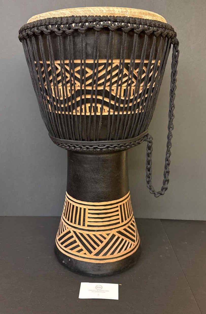 Lot # 22 - Robert K. Ghartey - Wood Djembe Drum with Kente Symbols, "Ultimate"