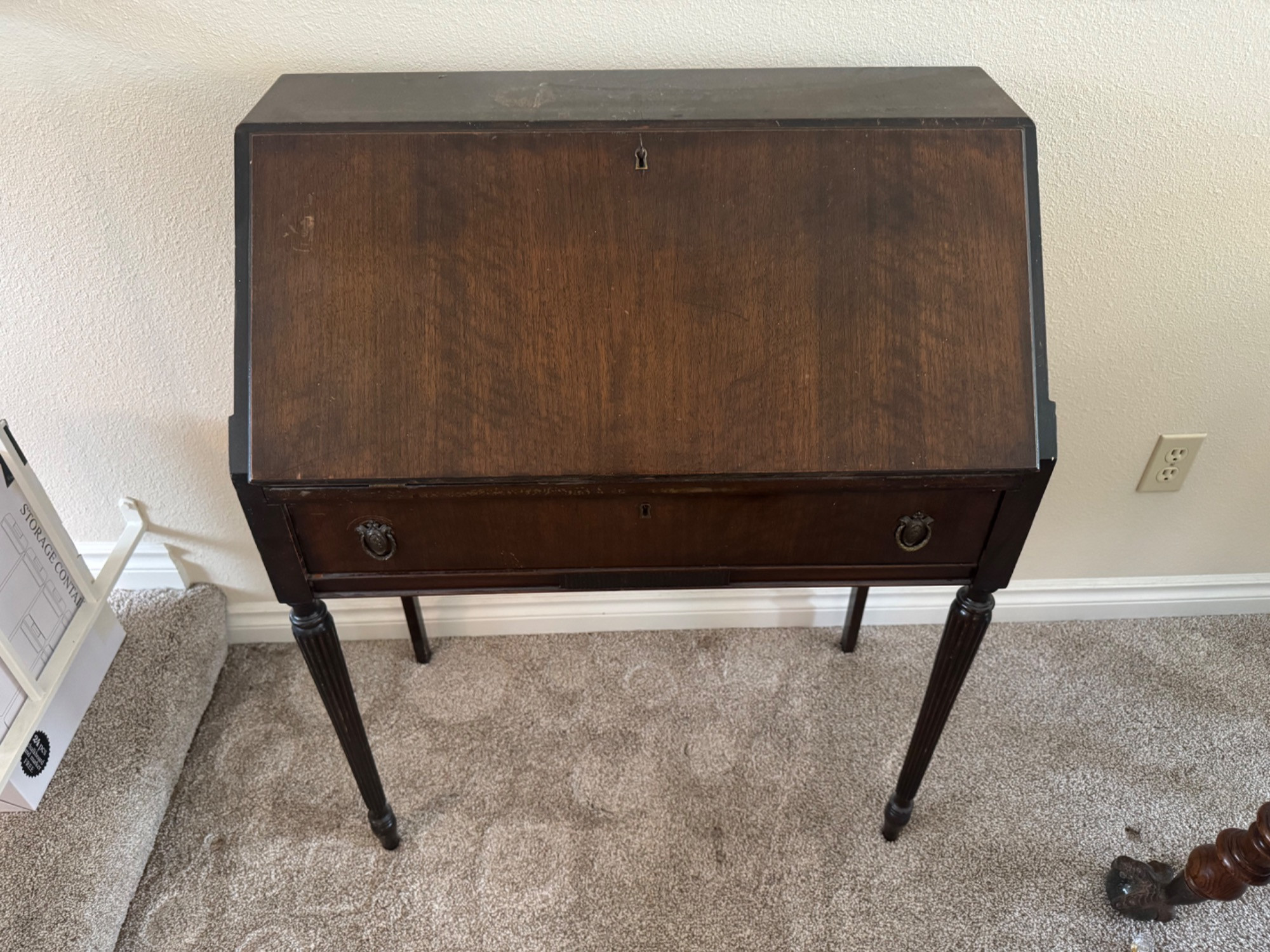 This is an antique drop-front secretary desk, likely from the early to mid-20th century. These types of desks feature a hinged writing surface that folds down to reveal storage compartments and cubbies inside. The fluted, tapered legs and dark wood finish give it an elegant, vintage appeal. This desk has some wear, as seen by the pictures, and is a great project for restoration. This desk has the key with it.