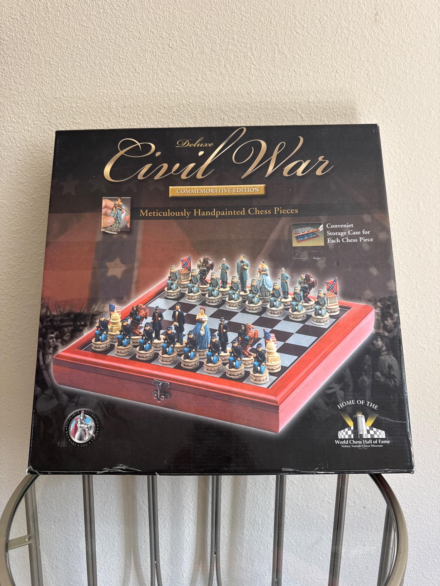 This is the Deluxe Civil War Commemorative Edition Chess Set, featuring meticulously hand-painted chess pieces representing figures from the American Civil War. Key Features: