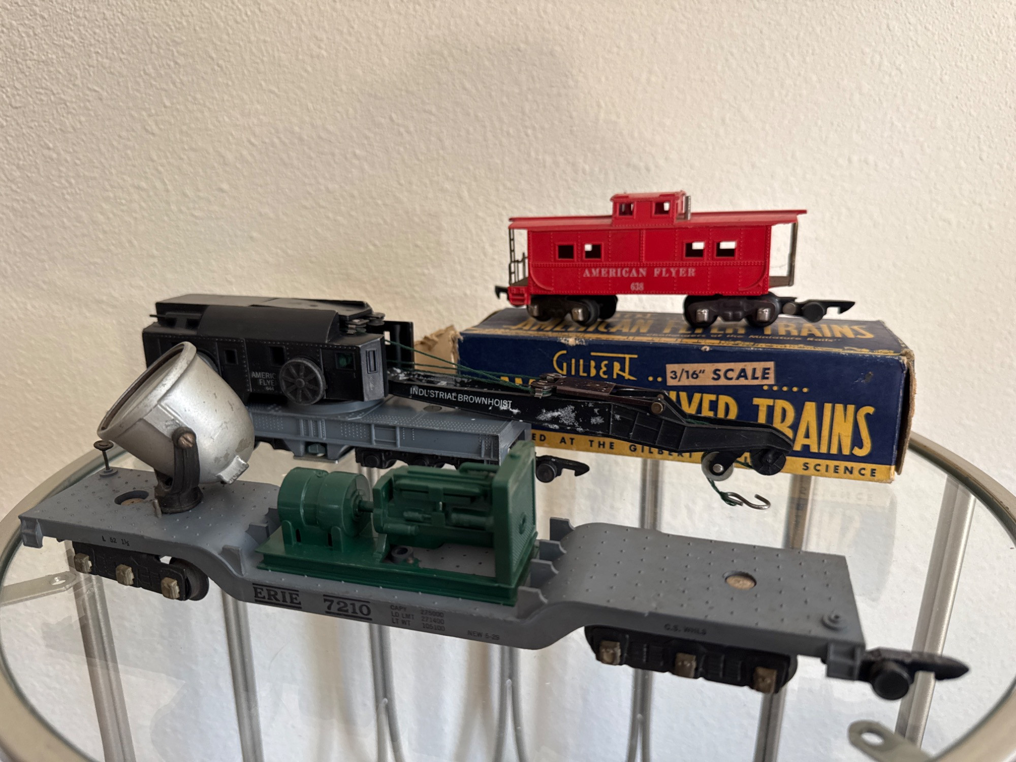 Lot # 40 - Qty 3 -American Flyer 638 Caboose, 7210 Searchlight, 644 Crane Car