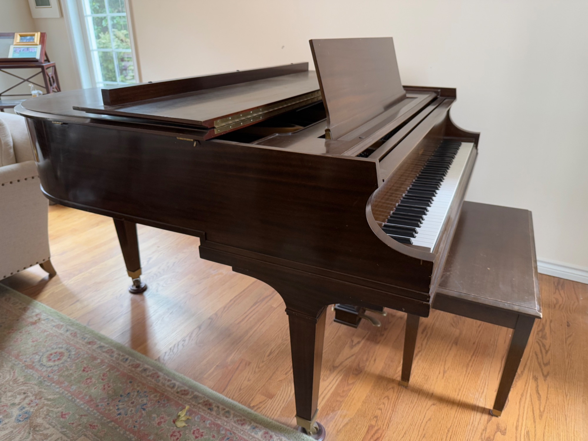 Baldwin Model C Grand Piano Description: Classic Baldwin Model C Grand Piano in dark mahogany/ebony finish Traditional grand piano design with curved body and lid prop Full 88-key keyboard with standard white and black keys Matching piano bench included Professional concert grand configuration Materials: Solid hardwood case (likely mahogany or other premium hardwood) Ebony or ebony-finished keys Cast iron plate (interior) High-grade steel strings Brass hardware and pedals Premium felt hammer mechanisms Piano-specific details: Length approximately 6'3" (Model C specification) Traditional curved case design Hinged top lid with support prop Three pedal system (sustain, sostenuto, una corda) Adjustable artist bench Casters for mobility Polished finish showing minimal wear Classic grand piano silhouette with sweeping curves Music desk for sheet music display