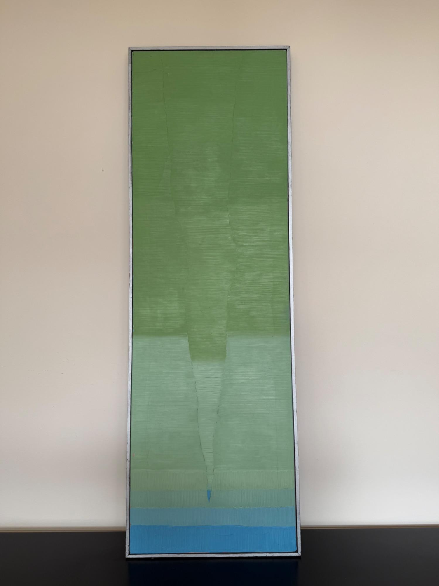 1973 Original Oil Painting with cracked texture features as part of the design. Paint Scenery: "The Seeking Root"; Root sipping through layers of soil to reach water beneath the ground surface. Material: Oil on canvas with wooden frame. Measurements: 51.25" H X 16.5 w