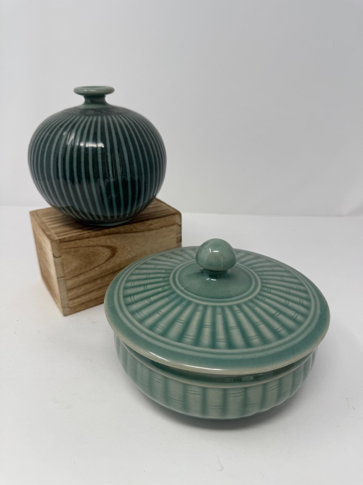 Enhance your home décor with this beautifully 2-piece ceramic pottery. Featuring a lidded bowl (6” x 2”) and a vase (5” x 4”) These pieces boast an elegant green glaze with ribbed detailing. Perfect for collectors, home styling, or as a unique gift!
