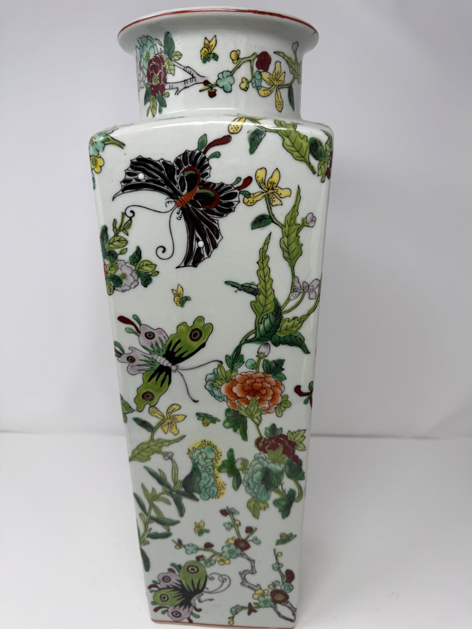 Porcelain Chinese Butterfly Famille Verte Faceted Vase. This is a beautifully decorated Chinese porcelain vase, likely in the Famille Verte (green family) palette, a style originating from the Qing Dynasty. The vase has a square shape, which is characteristic of traditional Chinese ceramics, and is adorned with intricate hand-painted floral and butterfly motifs. The Famille Verte porcelain style features vibrant enamel colors over a white porcelain base, with green being the dominant shade. Design elements: