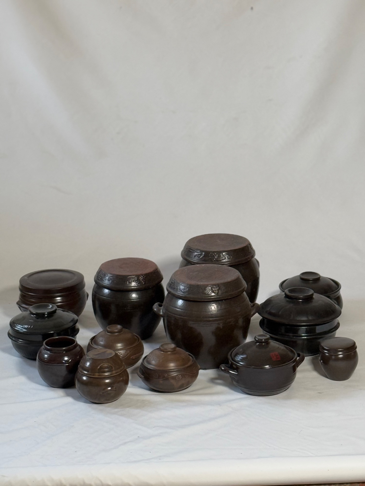 "Several Small In Scale Traditional Earthenware Lidded Crocks" These traditional